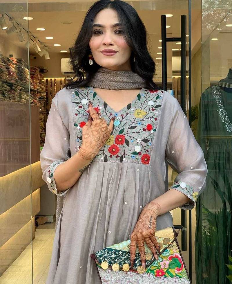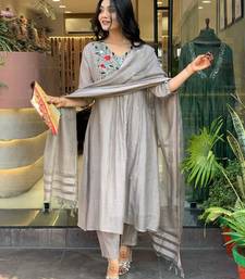 Ethnic festive wear grey chinon viscose stitched suit with dupatta