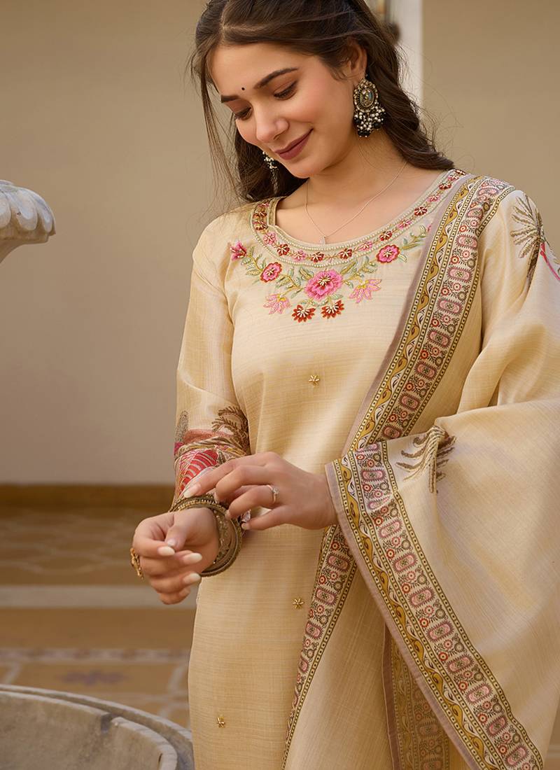 Ethnic festive wear off white viscose silk stitched suit with dupatta