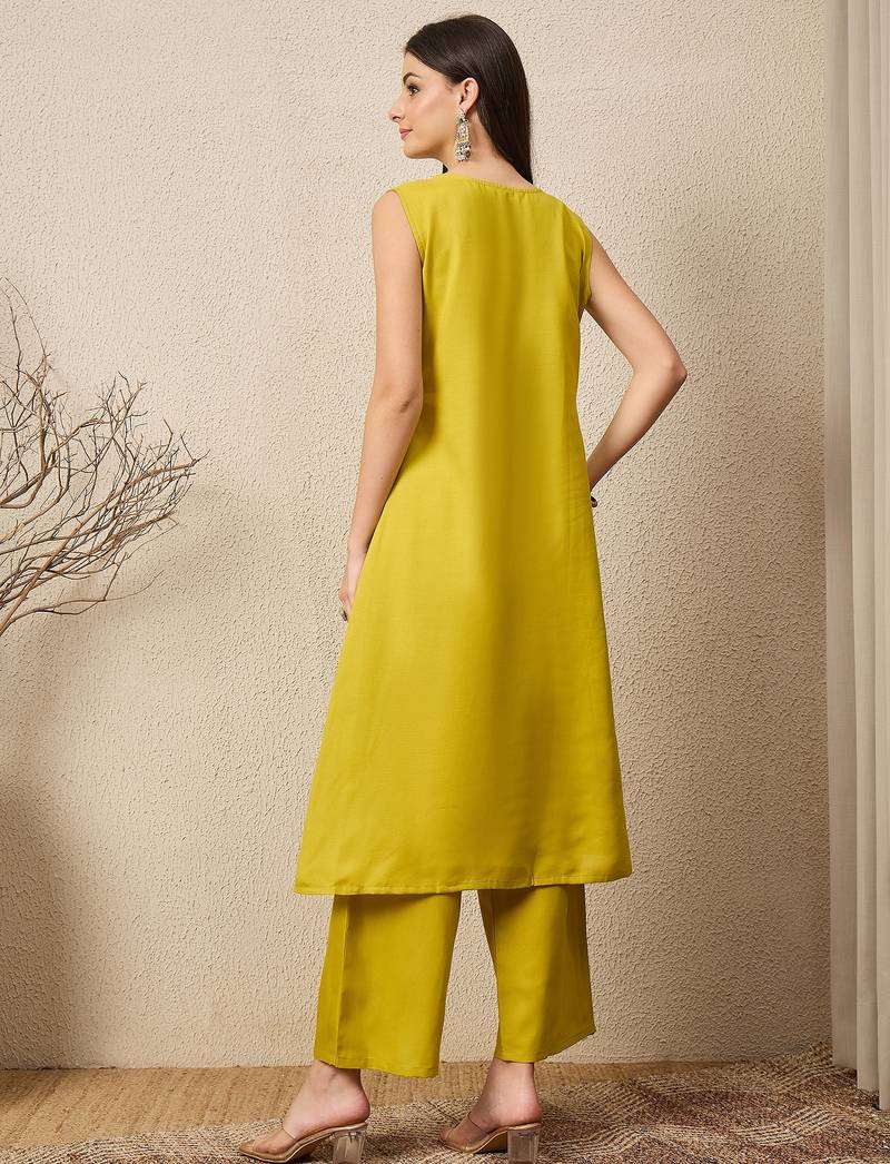 | Product Description | Grab This Stunning Kurta Set Crafted From Cotton Blend That Will Enhance Your Comfort And Be Easy To Carry A Whole Day Long. This Kurta Set Comes With An Kurta With Pant, With The Same In Sleeveless And A Simple But Graceful Round Or V Neck Neckline. The Yoke Part Has A Fine Fabric Designed. The Straight Line Pant Gives A Graceful Look To The Entire Kurta Set. Perfect For Teenage Girls To Modern Women, From A College To A Casual Outing This Outfit Will Give You Satisfaction After Wearing It. A Traditional Jumkas And Minimal Jewellery Give A Classy Look. |