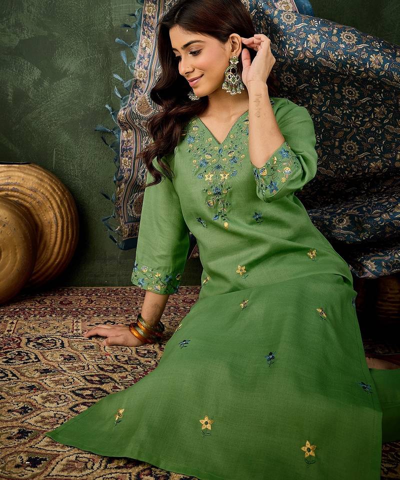 | • | Kameez | : | Color- Green / Fabric- Pure Silk Cotton |