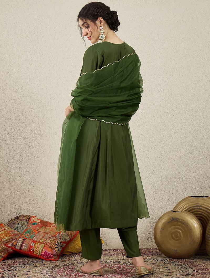 | • | Dupatta | : | Color- Olive / Fabric- Silk Blend |