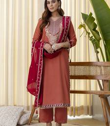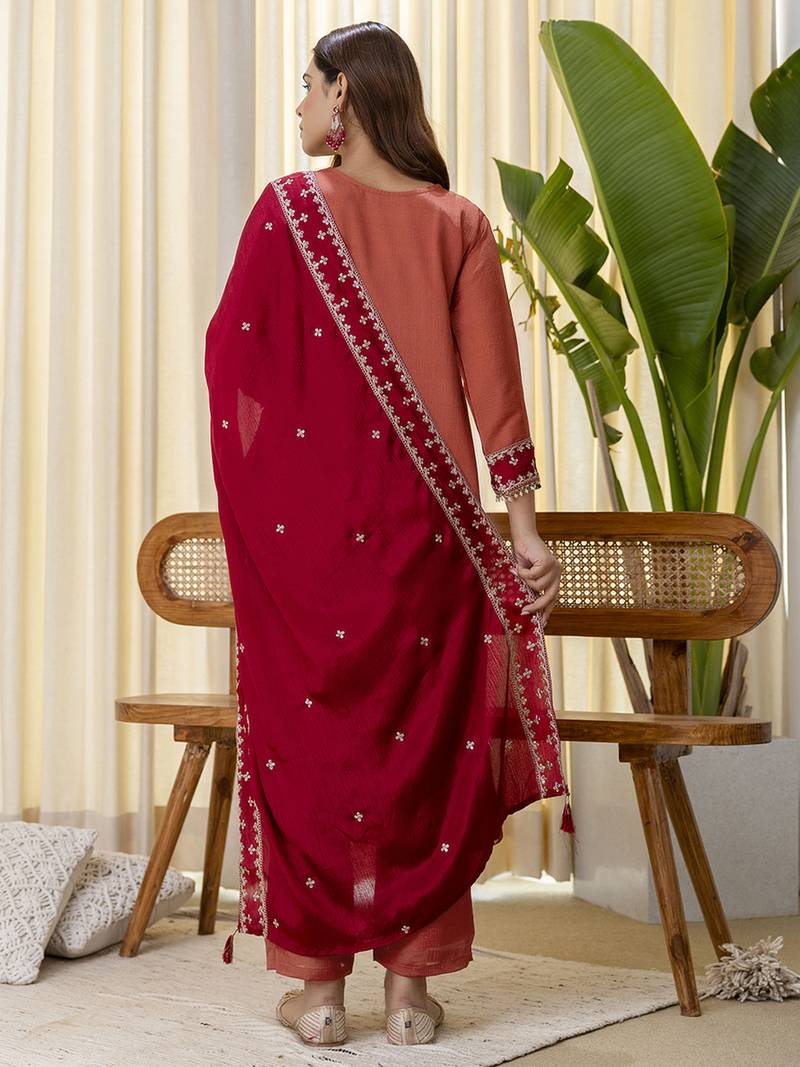 This Beautiful Women’s Ethnic Set Is Designed With A Stylish Kurti, Pant And Dupatta In 3 Piece Set That Combines Comfort With Elegance. The Embroidered Design Ethnic Wear Adds A Touch Of Traditional Charm While Maintaining A Modern Look, Making It A Perfect Choice For Festivals, Parties, Family Gatherings, Or Daily Wear. Crafted With Premium Fabric, This Ethnic Kurta Set With Dupatta Offers A Graceful Silhouette And Versatile Styling For All Occasions. The Trendy Ethnic Outfit For Women Ensures You Stand Out With Its Fine Detailing And Designer Appeal. A Must Have Ethnic Suit Set For Women To Elevate Your Wardrobe And Enhance Your Everyday Style.. The Silk Blend Fabric In This Attractive Color Ready To Wear Kurta Set Will Make Sure That The Fitting Of This Beautiful Readymade Kurta Set Looks Elegant On You. Crafted From Silk Blend Fabric , It Is Light In Weight And Will Be Soft Against Your Skin. Its Unique Design And Beautiful Colour Will Fetch A Lot Of Second Glances As You Club It With Contrast Colored Pumps And Flashy Accessory. Our Products Are Made And Stitched Using High Grade Fabrics And Yarns Under The Strict Surveillance Of Our Well Versed Executives. It Is Capable Of Making You Look Gorgeous. Wear It And Put Your Step In The World Of Fashion. It Looks Stunning Every Time You Match It With Accessories.
