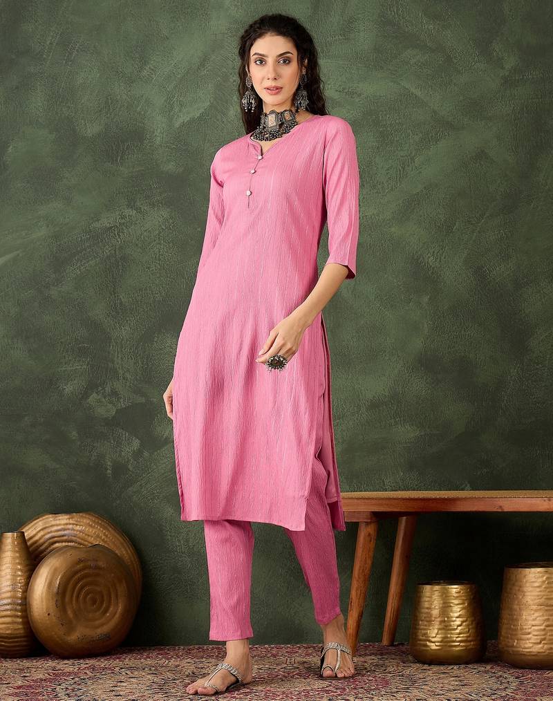 | Product Description | Grab This Stunning Kurta Set Crafted From Silk Belend That Will Enhance Your Comfort And Be Easy To Carry A Whole Day Long. This Kurta Set Comes With An Kurta With Pant, With The Same In Sleeves And A Simple But Graceful Round Or V Neck Neckline. The Yoke Part Has A Fine Fabric Designed. The Straight Line Pant Gives A Graceful Look To The Entire Kurta Set. Perfect For Teenage Girls To Modern Women, From A College To A Casual Outing This Outfit Will Give You Satisfaction After Wearing It. A Traditional Jumkas And Minimal Jewellery Give A Classy Look. |