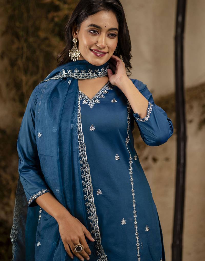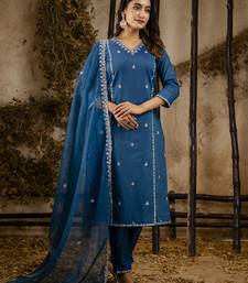 Women's embroidered silk blend kurta pant sets with dupatta stitched
