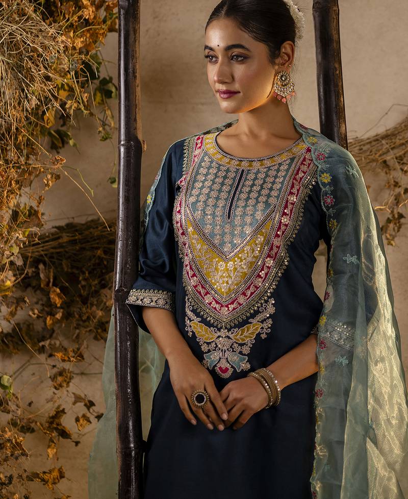 Product Name Teal Embroidered Viscose Rayon Straight Kurta Set With Dupatta