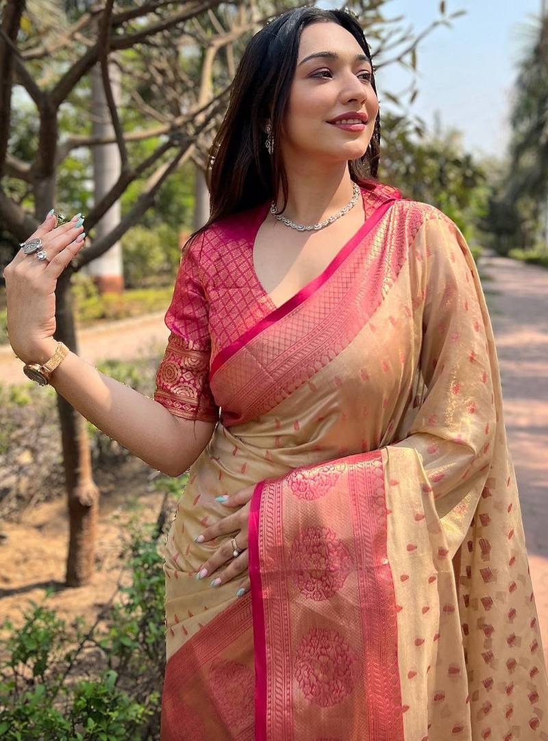 Cream plain silk silk-sarees saree with blouse