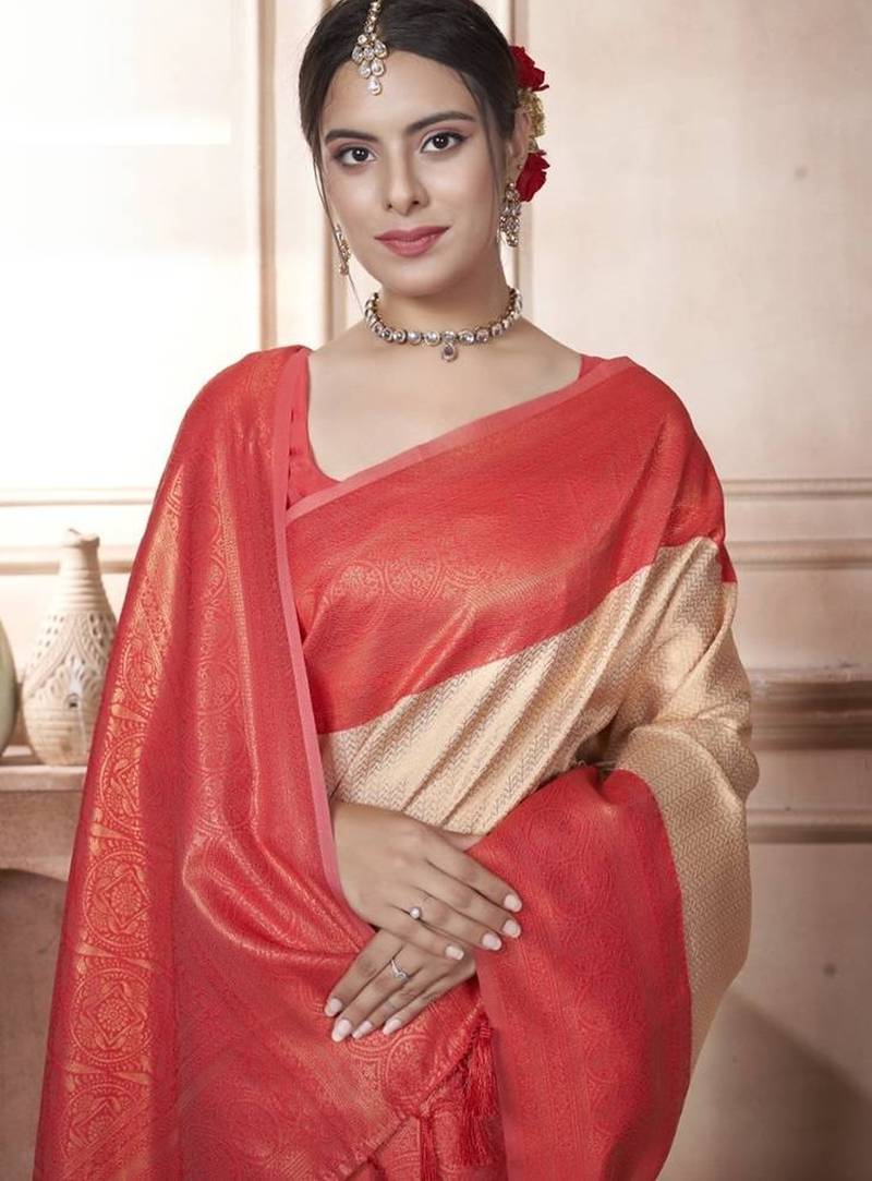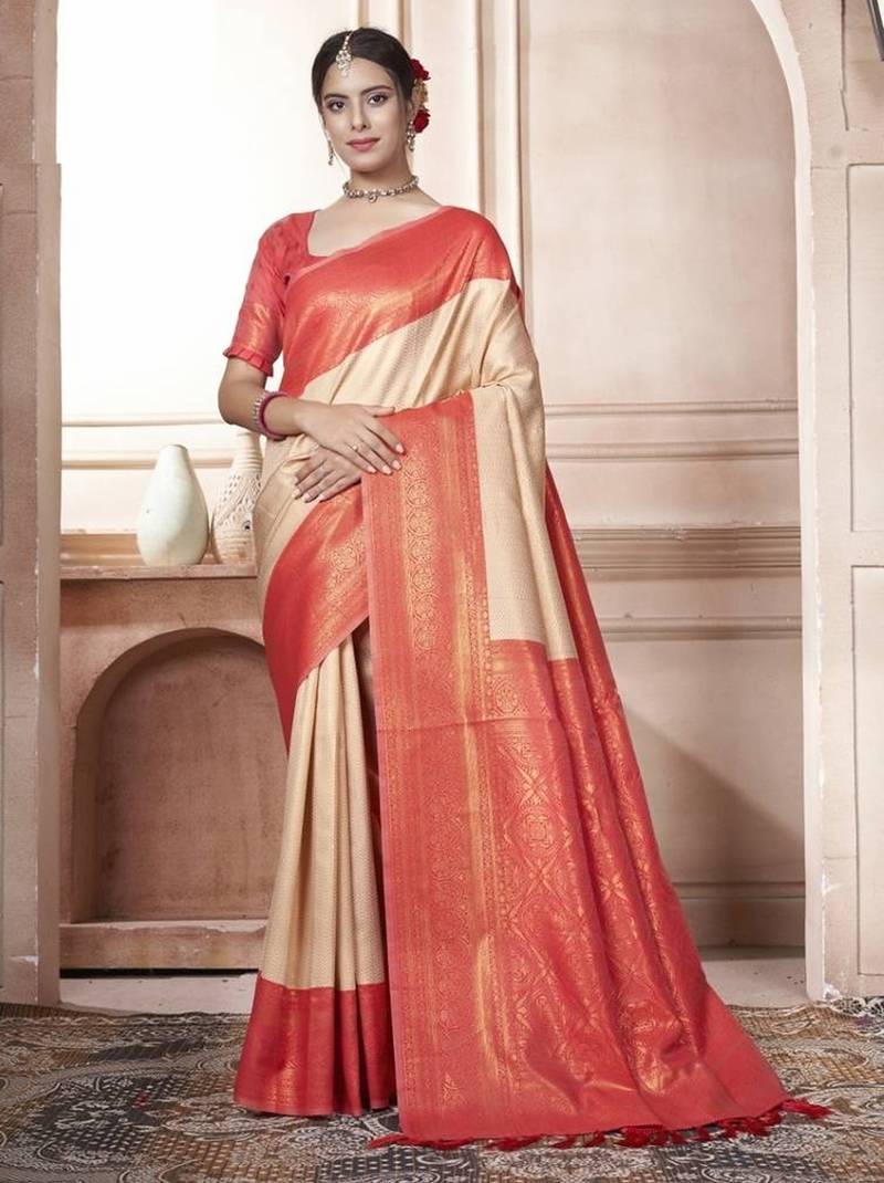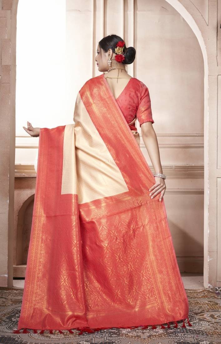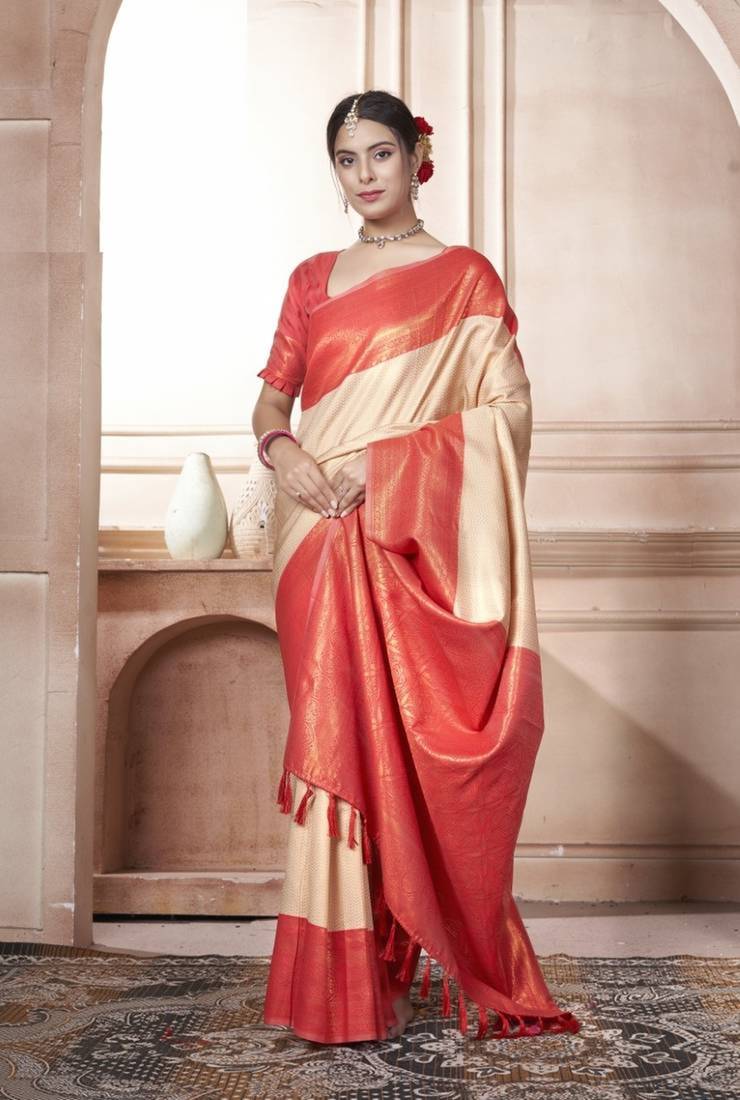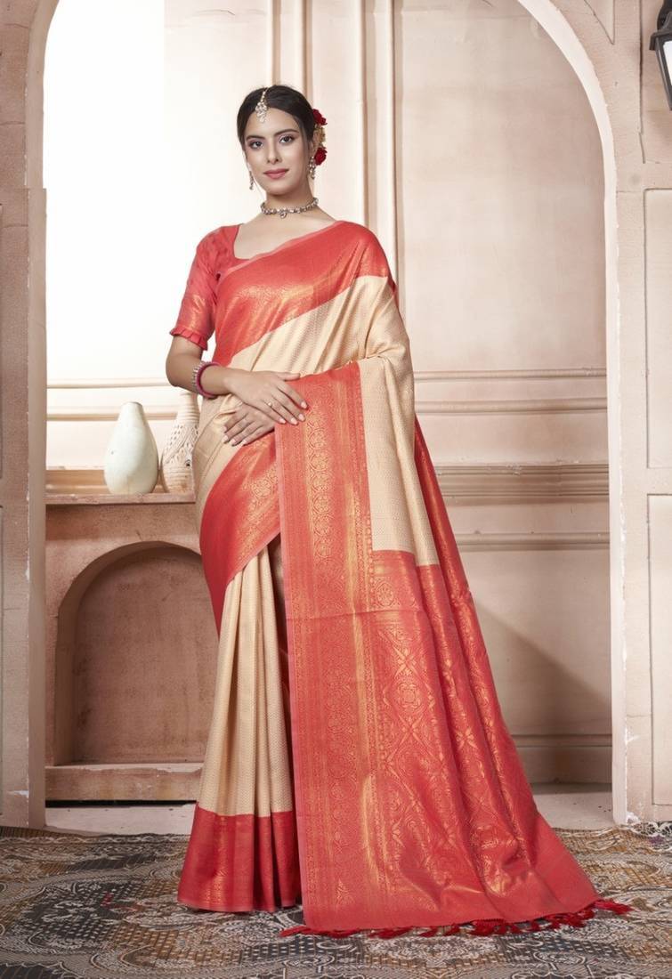 Light peach kanjivaram silk blend zari weaving with gold zari border and pallu saree with blouse for women