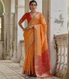 Orange solid raw silk blend saree with blouse