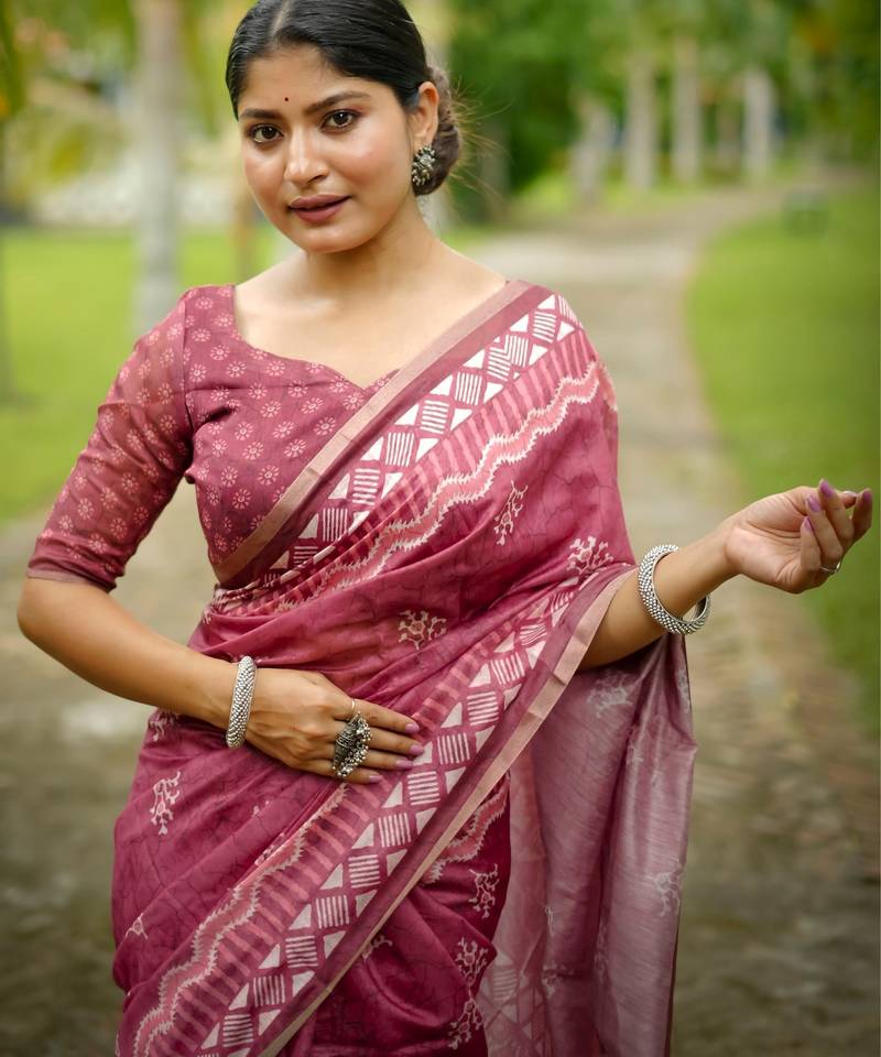 | Product Description | Very Soft And Pretty Feel Dhanwari Cotton Saree With Traditional Digital Block Print Catalogue And Tiny Zari Border With Contrast Blouse Piece |