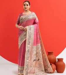 Pink solid tussar silk saree with blouse