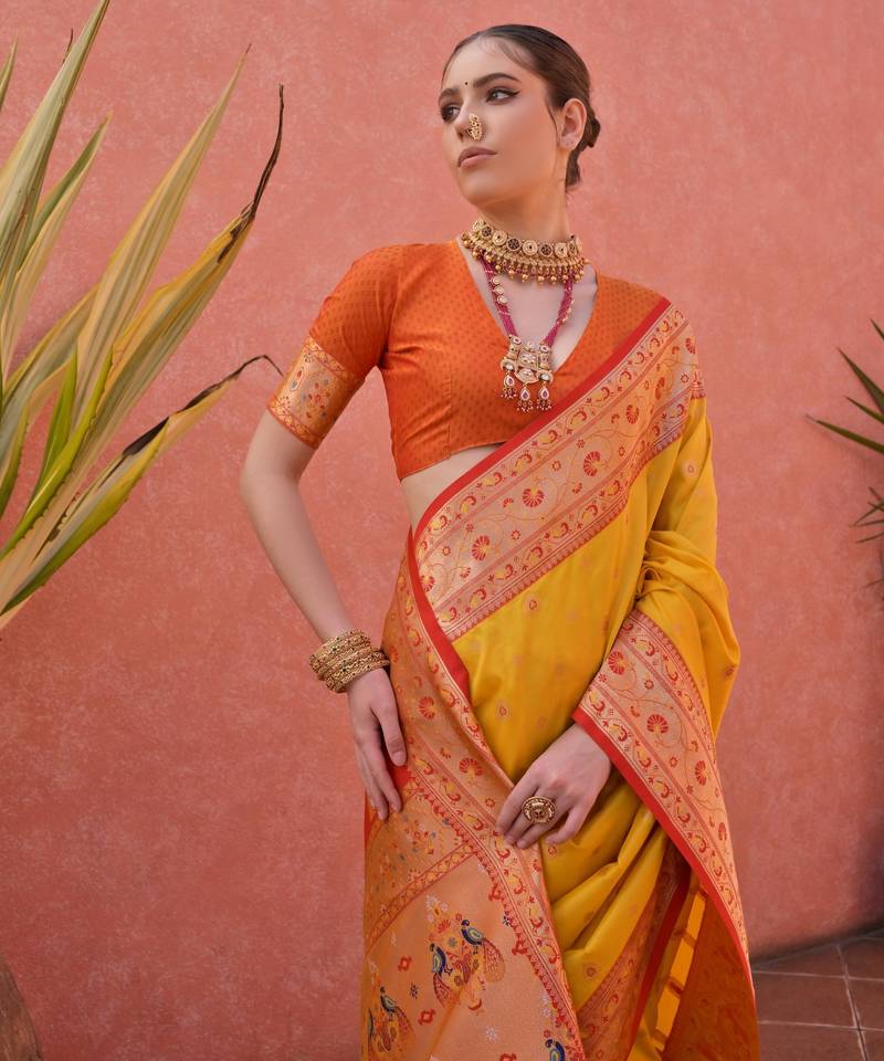 | Product Description | Soft Banarasi Silk Paithani Saree With Elegant Contrast Weaving Border And Rich Zari Woven Pallu With All Over Tiny Zari Woven Butties And Fancy Tassels And Contrast Self Butti Weave Blouse Piece |