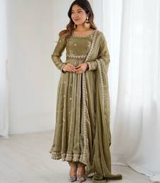 Olive green fandy silk anarkali gown set with cording & sequence work