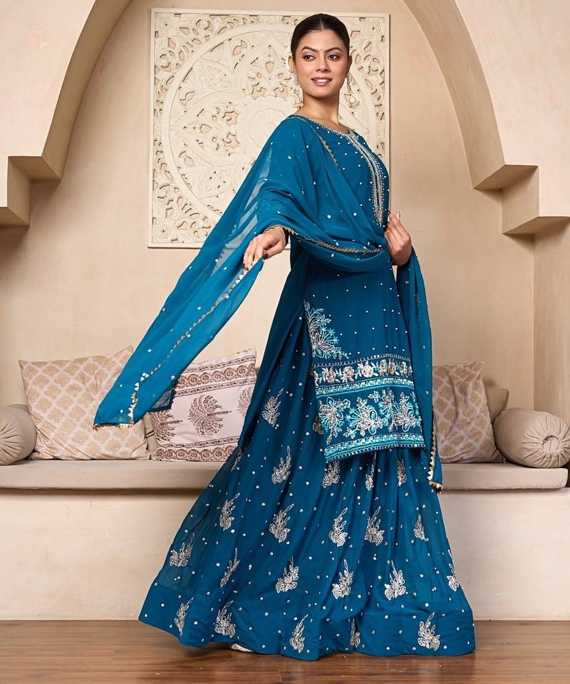 | Product Description | This Is A Sophisticated Three Piece Ethnic Suit Featuring A Short Kurti (Top), Voluminous Sharara (Bottom), And A Matching Dupatta. The Outfit Is Characterized By Its Deep Teal Hue And Intricate Zari And Sequin Embroidery. The Kurti Features A Detailed Neckline And A Heavily Embellished Border With Floral Motifs. The Sharara Is Adorned With Scattered "Butti" Work And Larger Floral Motifs Near The Hem, Providing A Graceful Flare. The Dupatta Is Finished With A Delicate Scalloped Gold Border, Tying The Whole Look Together For A Festive Or Wedding Occasion. |