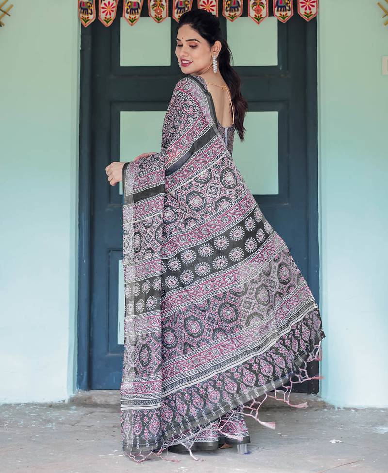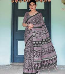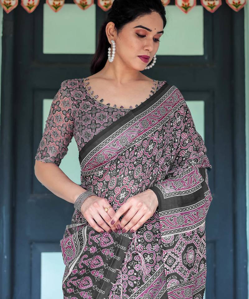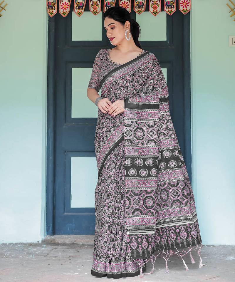 Black printed art silk designer pallu saree