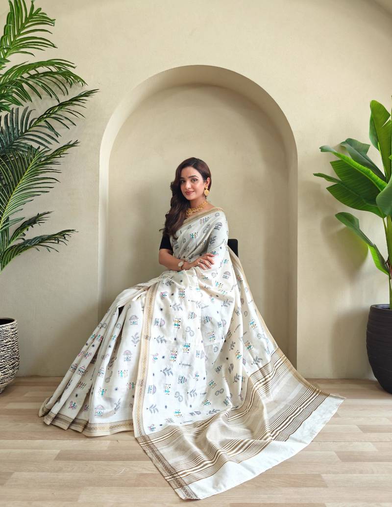 Cream art silk woven saree