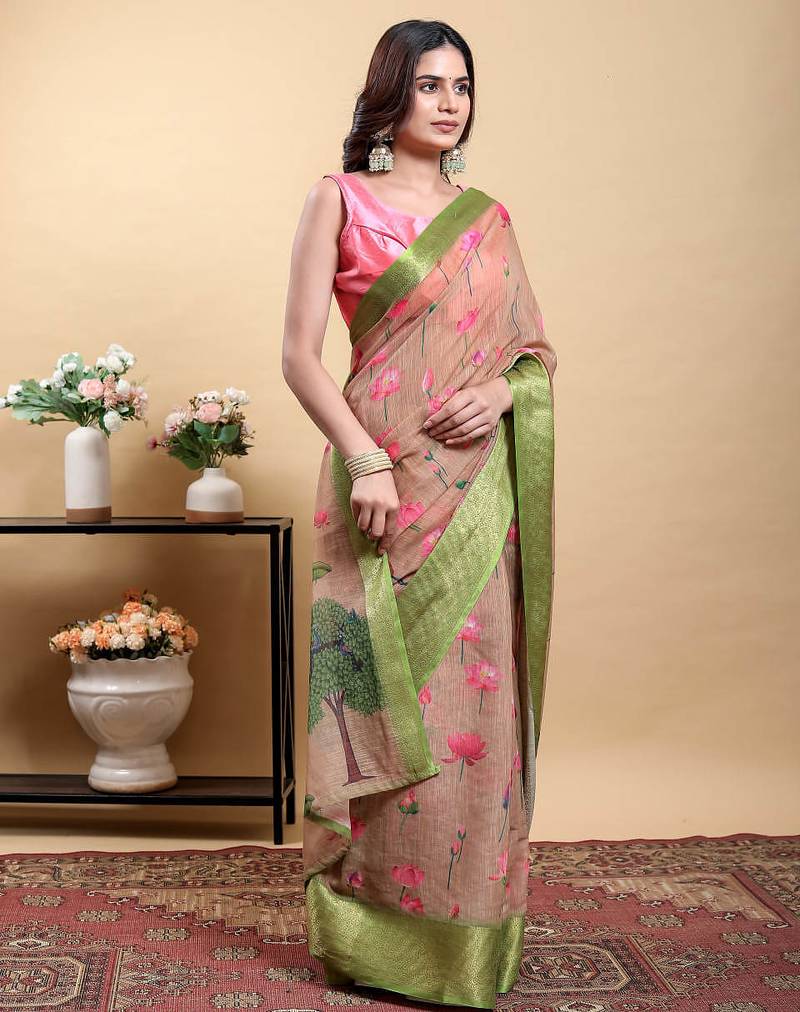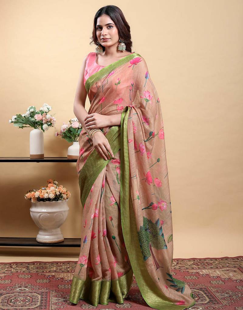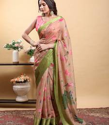 Cream printed art silk designer pallu saree