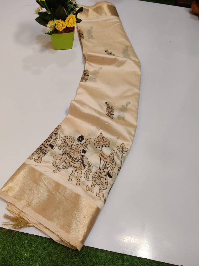 Cream tussar silk saree with kalamkari design & embroidery work