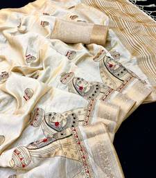 Cream tussar silk saree with kalamkari design & embroidery work