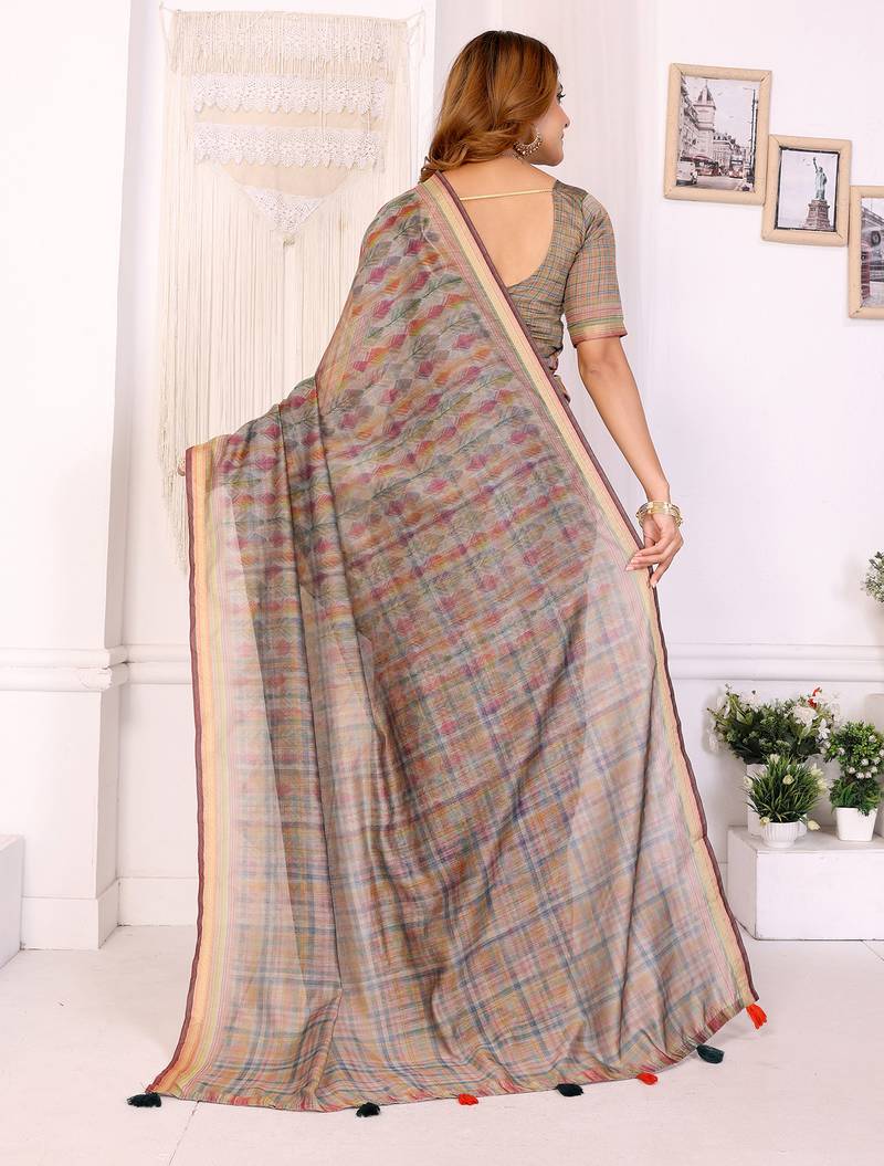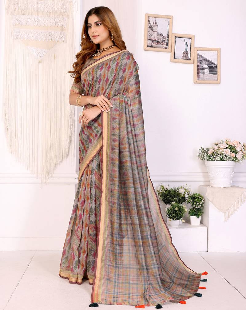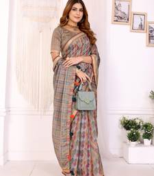 Grey printed art silk designer pallu chanderi saree