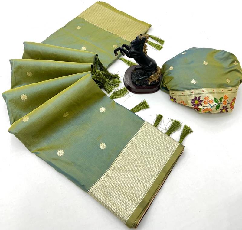 Light green soft silk paithani saree with floral zari border & designer pallu