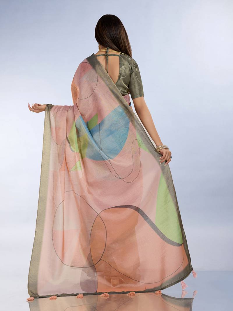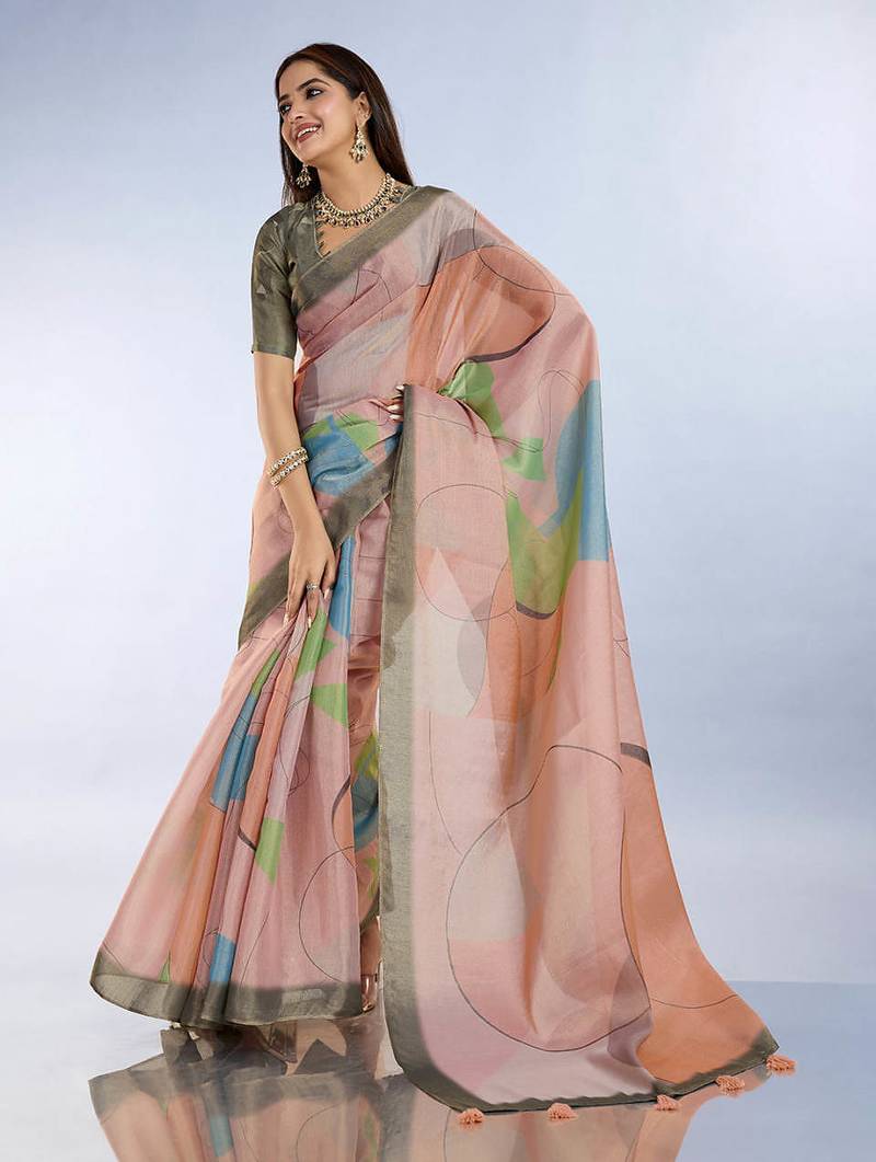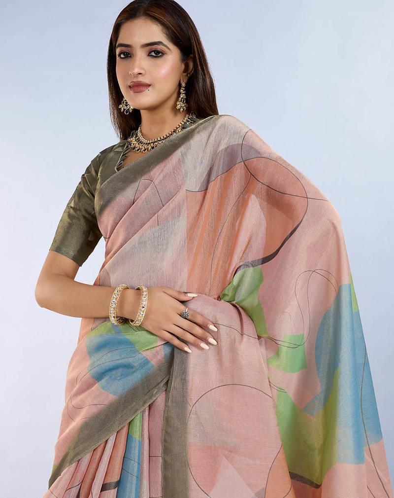 Light peach printed art silk designer pallu saree