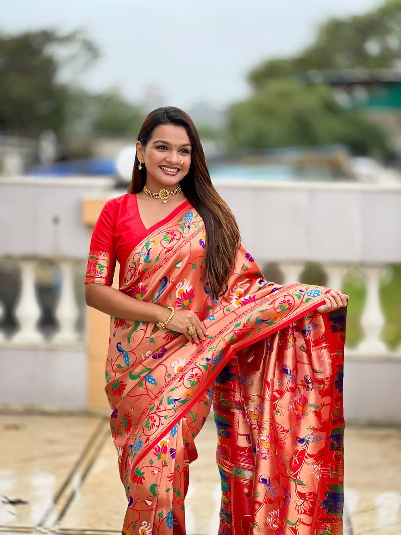 | Product Description | Soft Kanjivaram Paithani Silk Saree With Zari Weaving Meenakari Design All Over The Saree & Meenakari Weawing Rich Pallu With Meenakari Weawing Swan Border & Tessels Attached At Pallu End. Blouse : Soft Silk Weawing Blouse Piece |