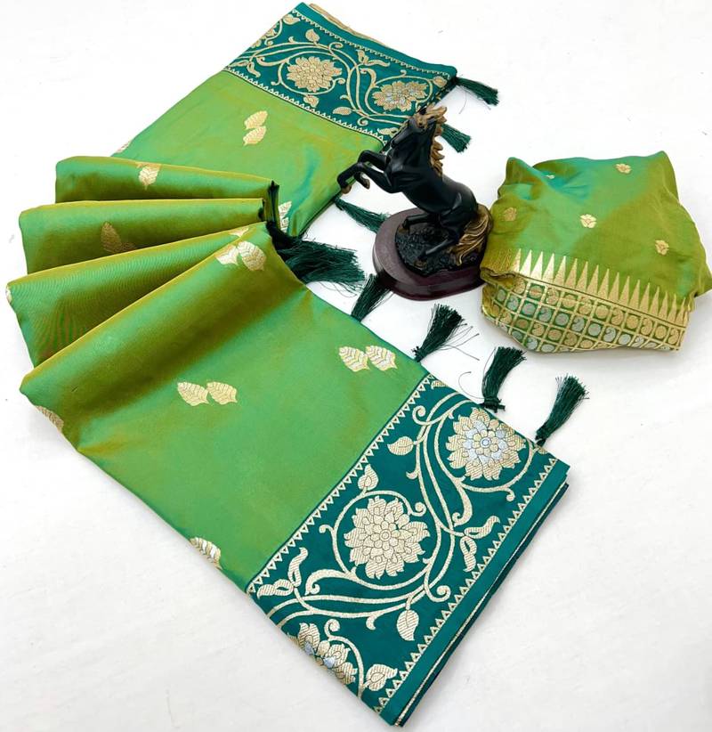 | Product Name | Parrot Green Premium Soft Silk Saree With Zari Weaving & Floral Border | |
