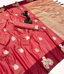 Red soft silk saree with zari weaving & peacock motifs