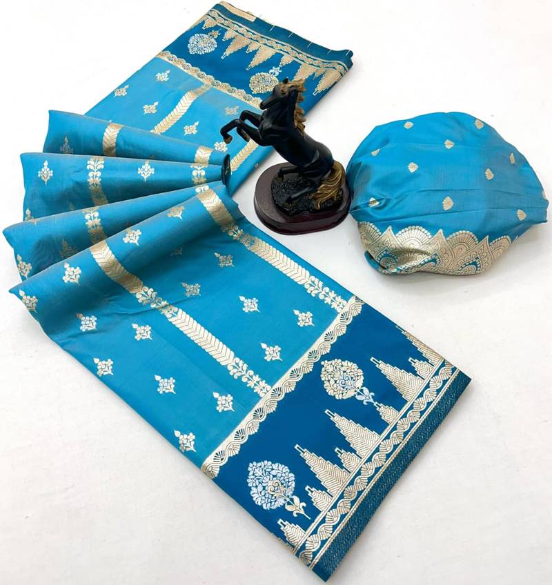 | Product Name | Sky Blue Soft Silk Saree With Zari Weaving & Striped Motifs | |