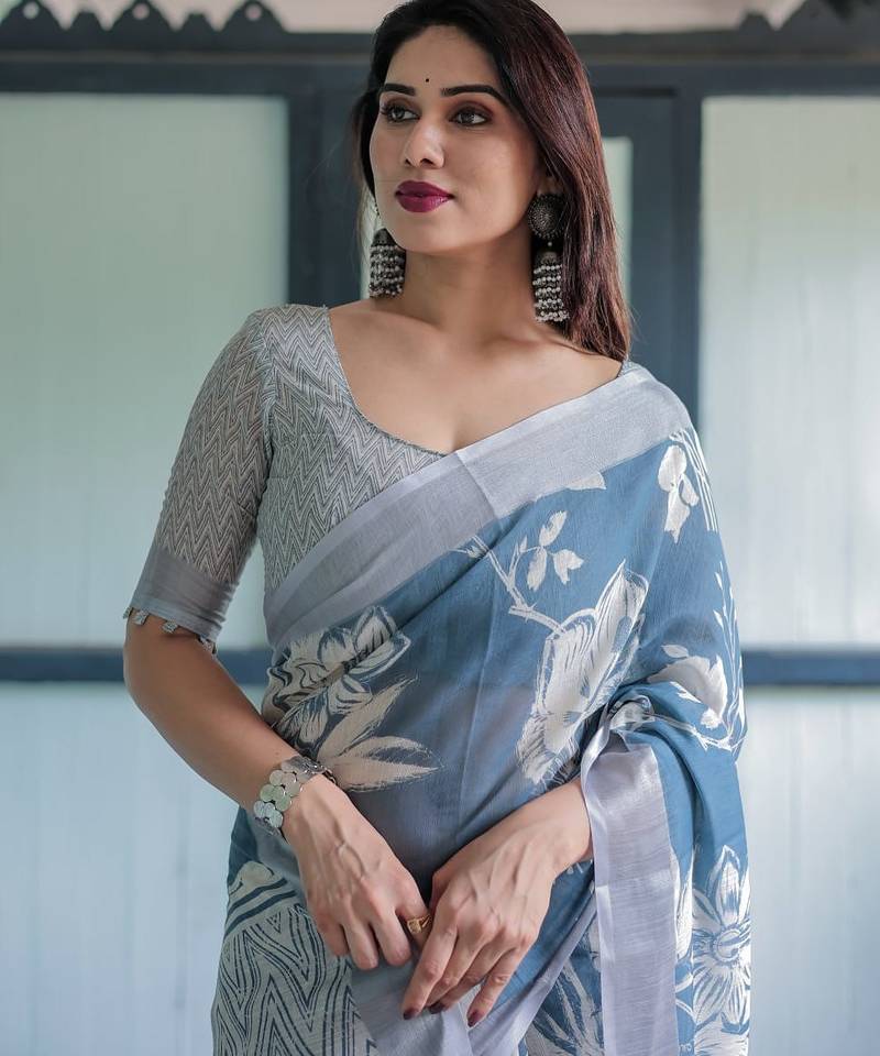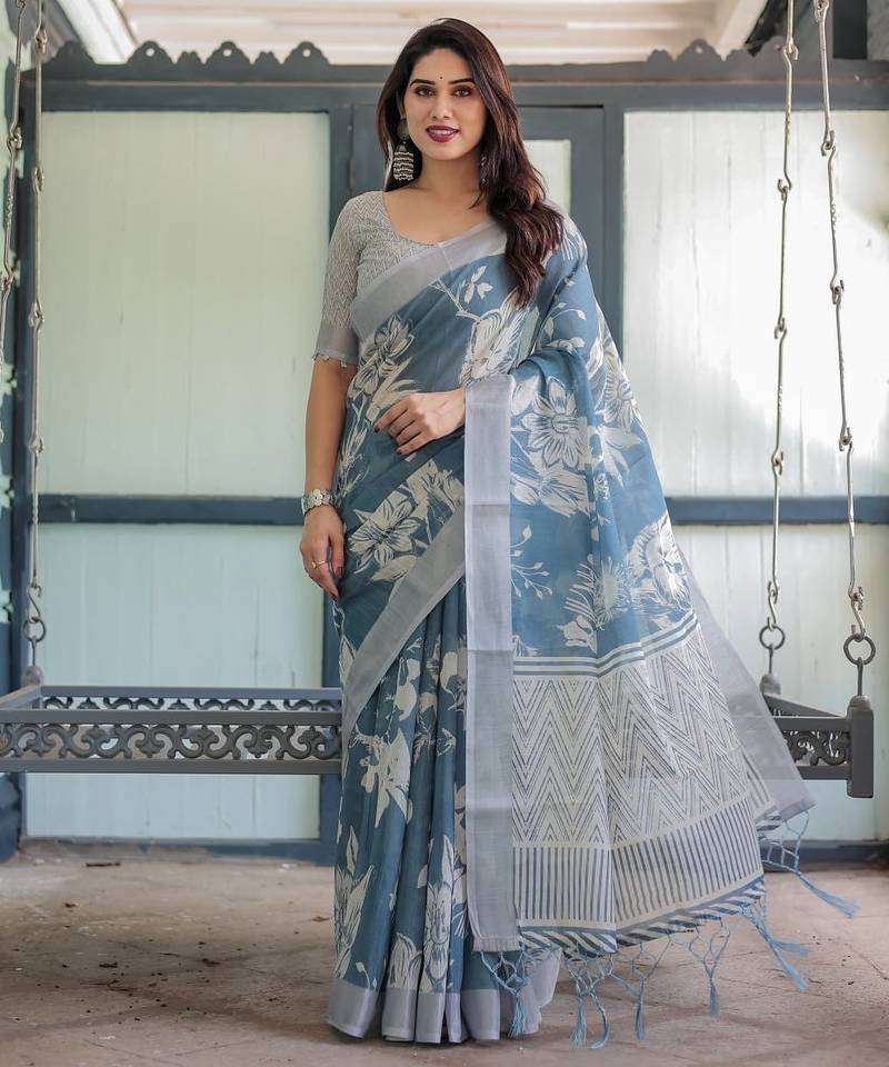 Teal printed art silk designer pallu saree