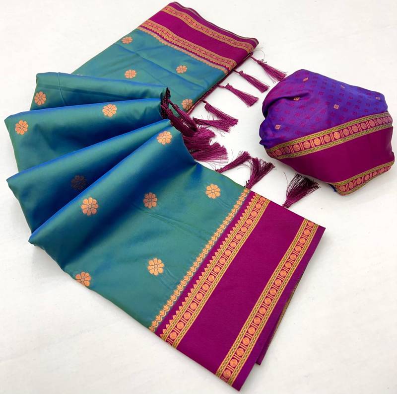 Teal soft silk saree with dual zari motifs, narayan border & contrast pallu