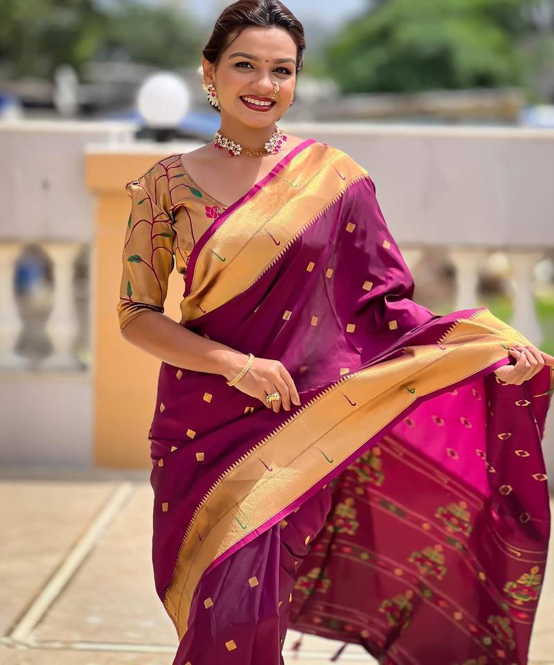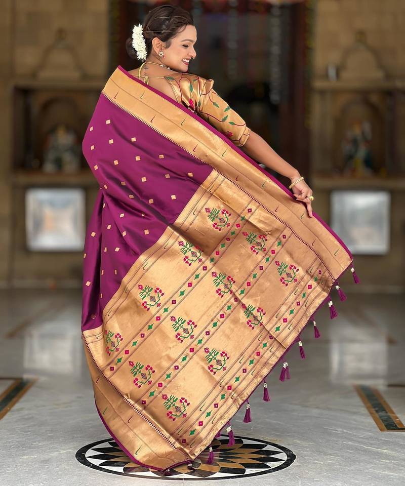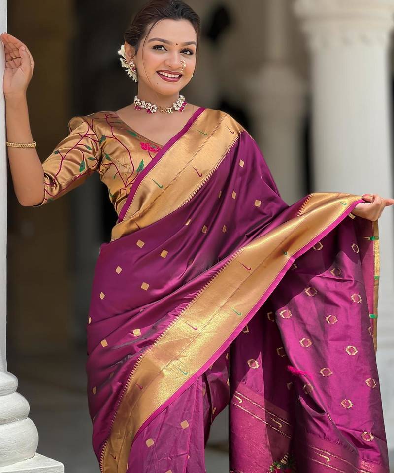| Product Description | Soft Paithani Silk Saree With Zari Weawing Motifs Design And Meenakari Weawing Rich Pallu With Meenakari Weawing Double Munia Border & Tassels Attached At Pallu End. Blouse : Enrich Silk Weawing Blouse Piece With Sleeve Border , |