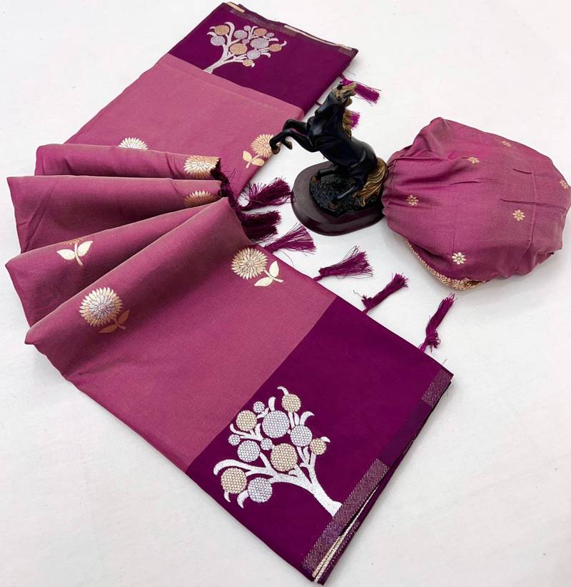Wine soft silk saree with zari weaving & floral motifs