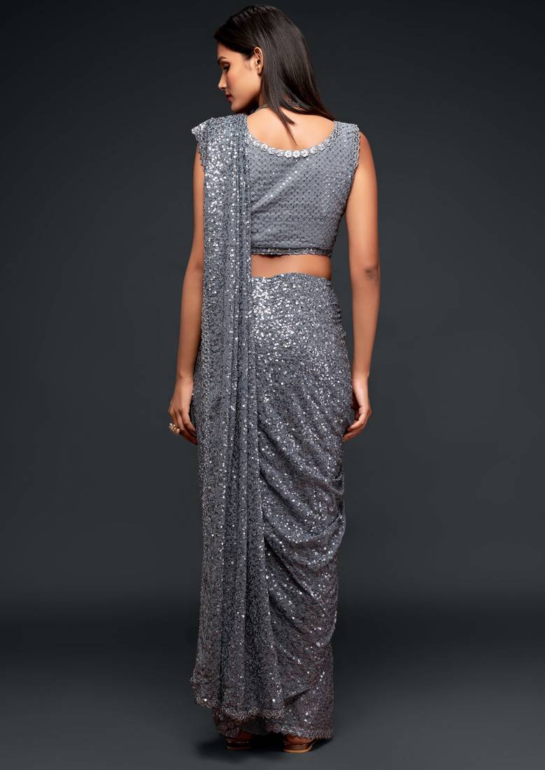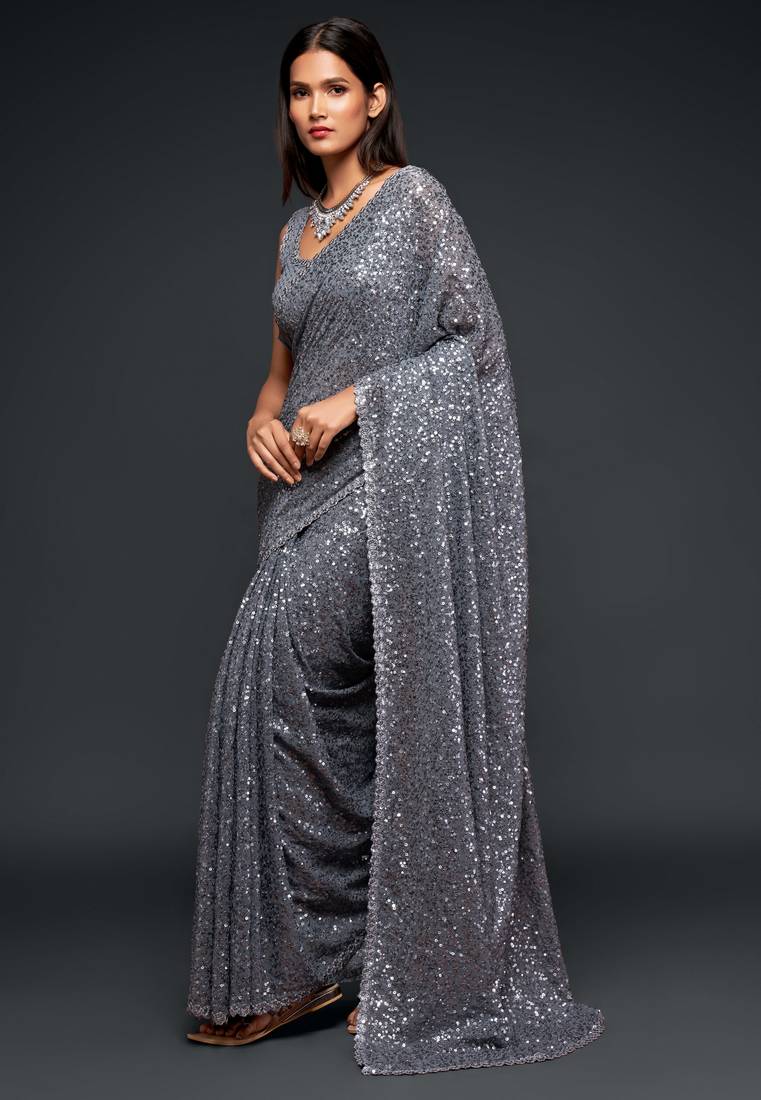 Grey georgette saree with thread & multiple sequins embroidery