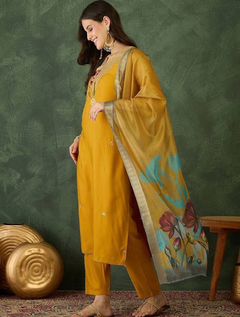 | Product Description | Women's Rayon Embroidered Straight Kurta With Pant And Dupatta Sets Color = Mustard Size = S, M, L, Xl, Xxl, 3 Xl Product Detail ➡ Kurti = Stiched ➡ Kurti Material = Rayon ➡ Work = Embroidered ➡ Bottom = Stiched ➡ Bottom Material = Rayon ➡ Dupatta = Stiched ➡ Dupatta Material = Organza ➡ Dupatta Length = 2.10 Meter |