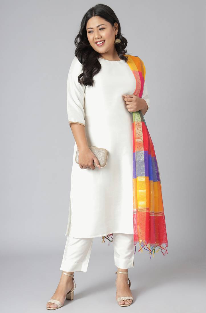 | Product Description | An Exploration Of The Modern Vocabulary Of Design, This Off White Kurta And Pant Set From Xl Love By Janasya Is Sure To Allure You. Tailored To Sartorial Perfection From Poly Silk, It Features Lace Detailing On Neckline And Sleeves Hem And Comes With Multicolor Woven Art Silk Dupatta To Highlight The Solid Kurta And Pant. Pair It Up With Traditional Earrings And Mojris For Complete Ethnic Look. |