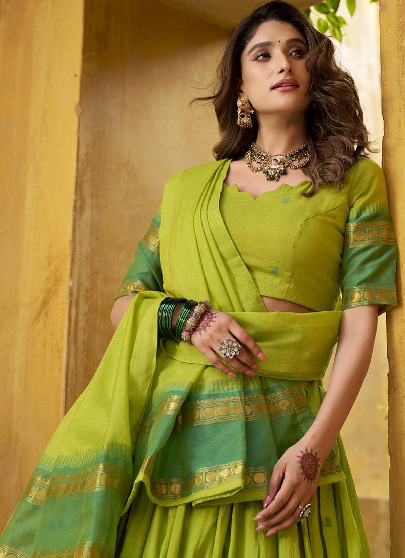 Green south indian half saree lehenga with dupatta – festive traditional wear for women