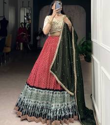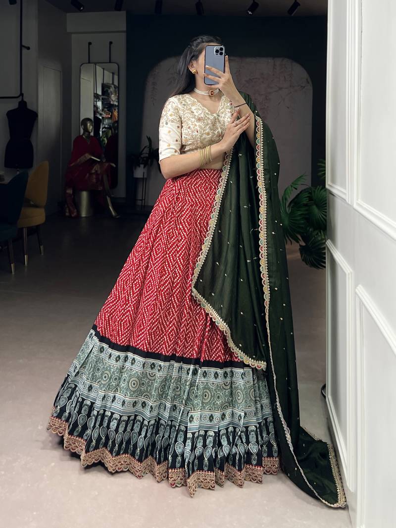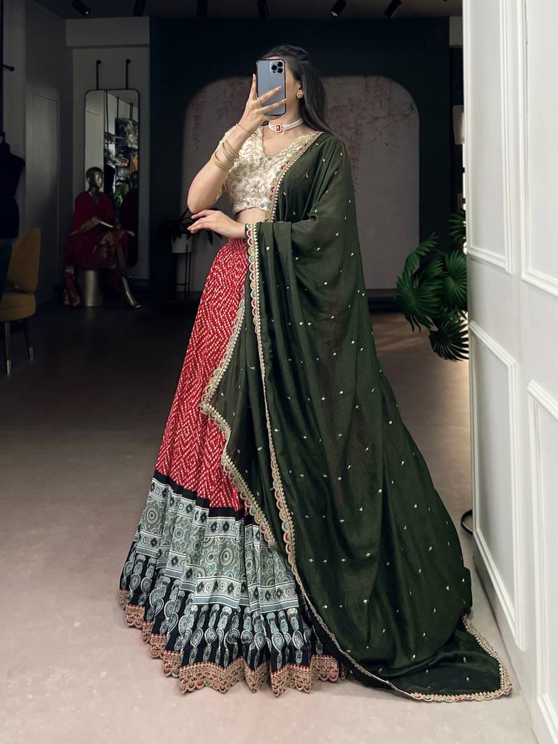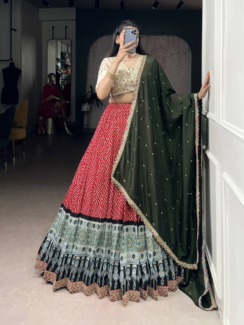 Rayon bandhej chaniya choli with sequins & thread embroidery lace