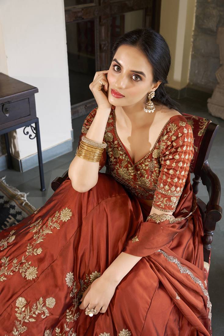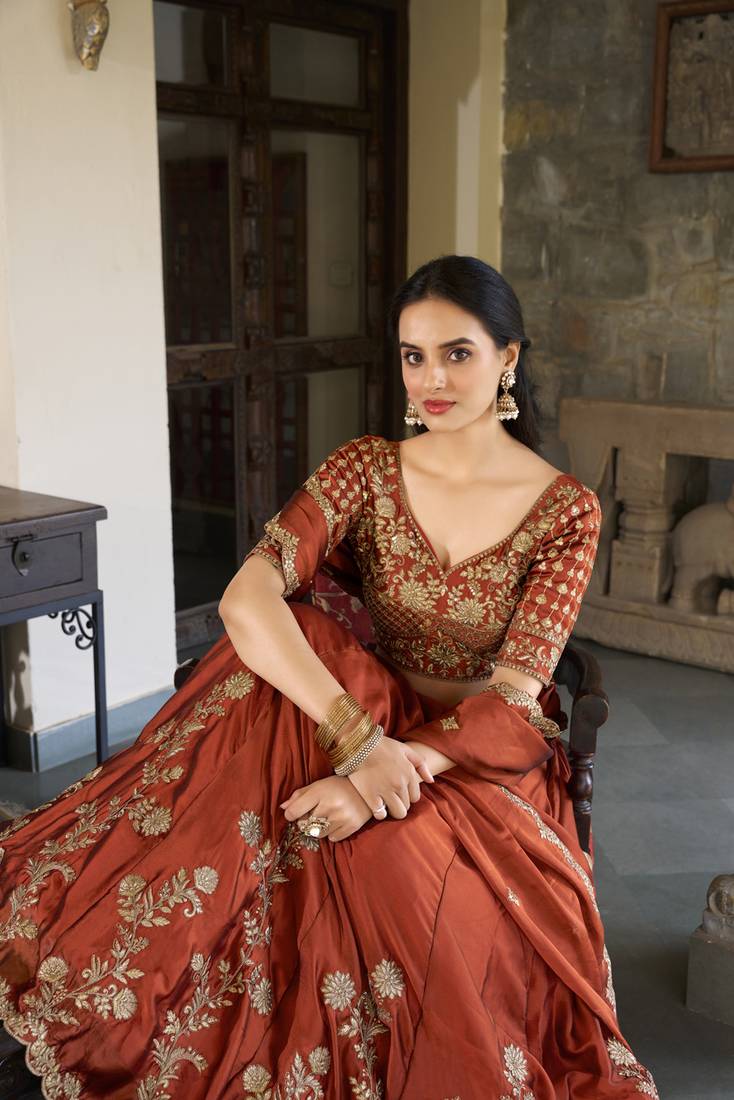 Rust rangoli silk chaniya choli with sequins & thread embroidery