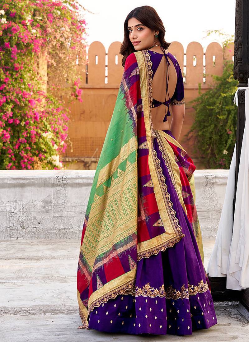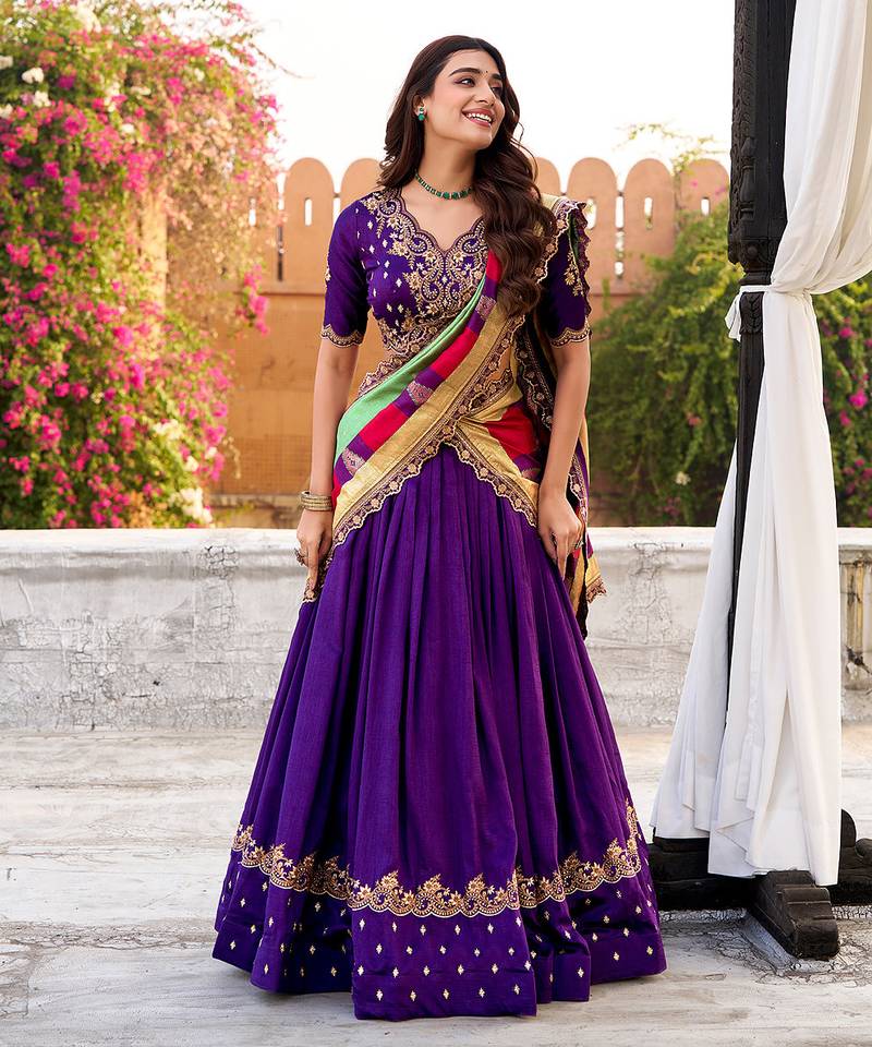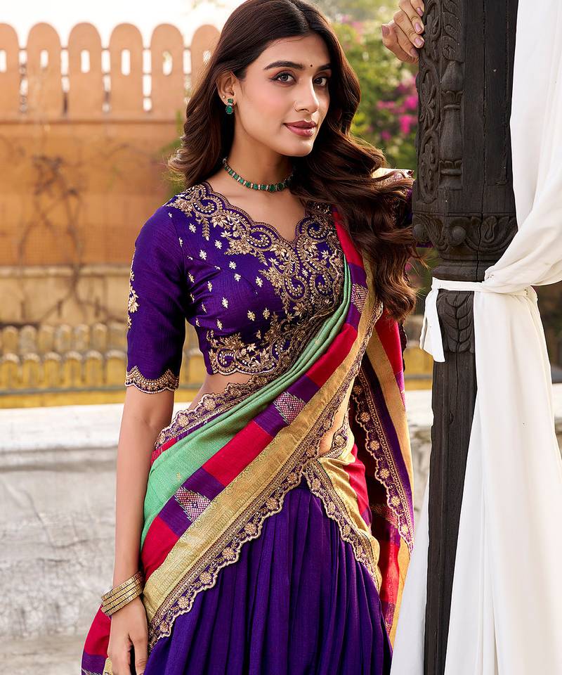 | Product Description | Bring A Rich Festive Elegance To Your Look With This Purple Vichitra Silk Chaniya Choli Set. The Deep Purple Choli Is Beautifully Enhanced With Sequins And Detailed Thread Embroidery, Creating A Refined And Traditional Appeal. The Flared Purple Chaniya Features An Embroidered Border That Adds Grace And Movement To The Outfit. Completing The Set Is A Vibrant Multicolor Dupatta, Designed With Woven Patterns And Intricate Scalloped Edging. The Contrast Of The Multicolor Dupatta Perfectly Complements The Purple Base, Making The Outfit Stand Out During Celebrations. This Stitched Chaniya Choli Set Is Ideal For Weddings, Festive Events, Sangeet Nights, And Cultural Functions. |