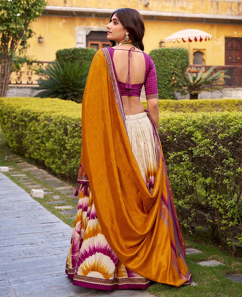 Tasar silk tie-dye print chaniya choli with lace touch-up