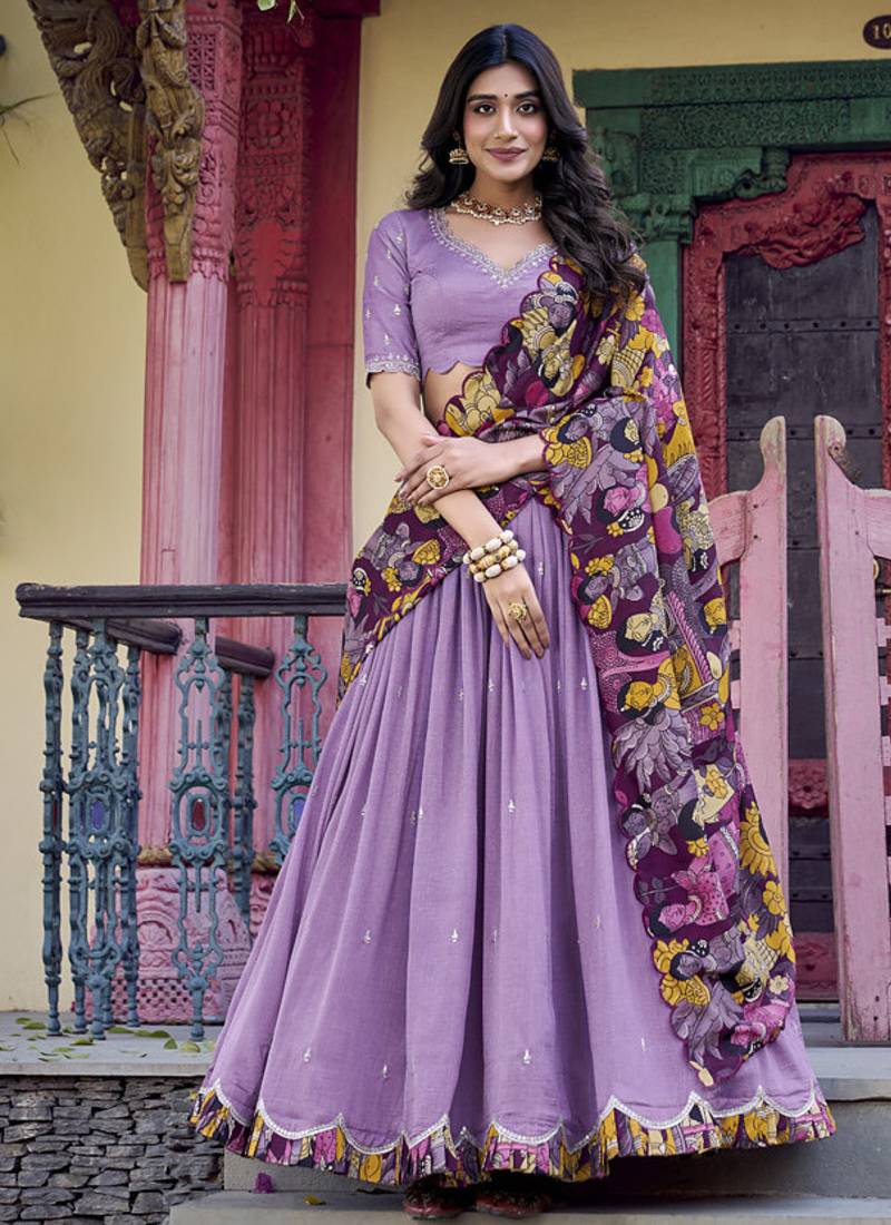 Lavender charm in vichitra silk sequins embroidery with kalamkari border