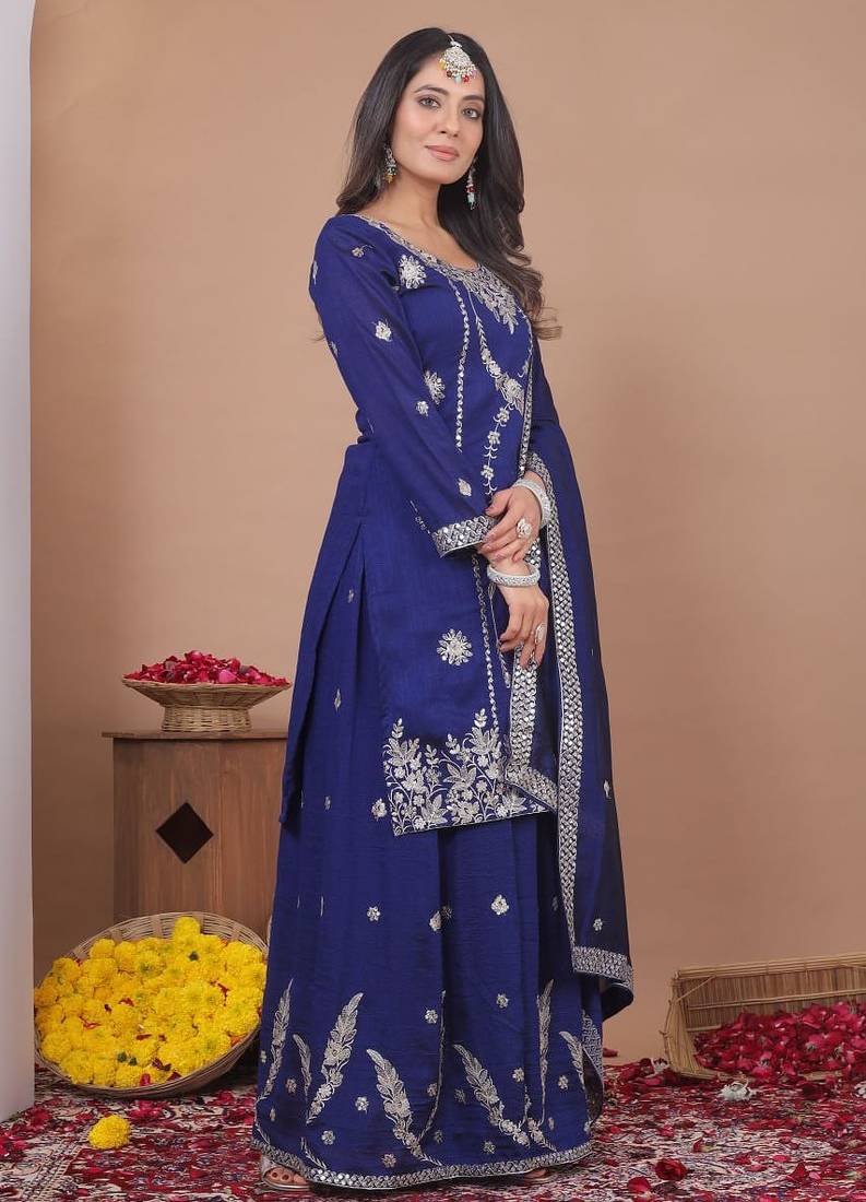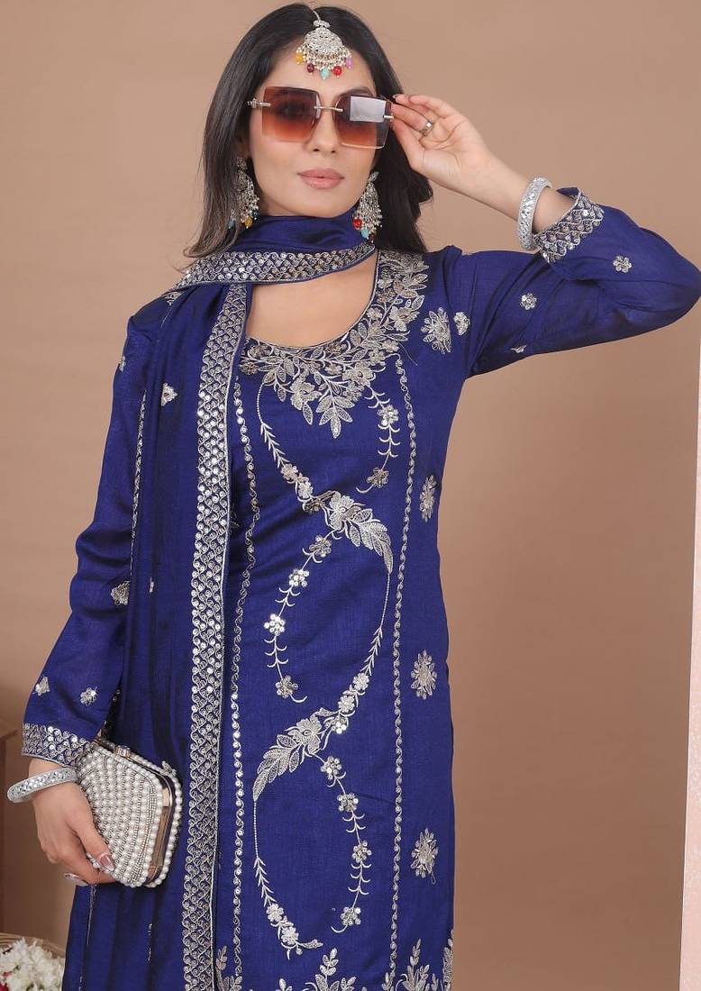 Blue vichitra sik party wear embroidery suit set stitched