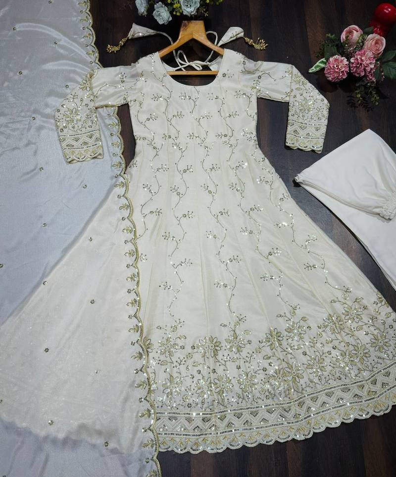 Cream chinon silk party wear embroidery anarkali suit set stitched