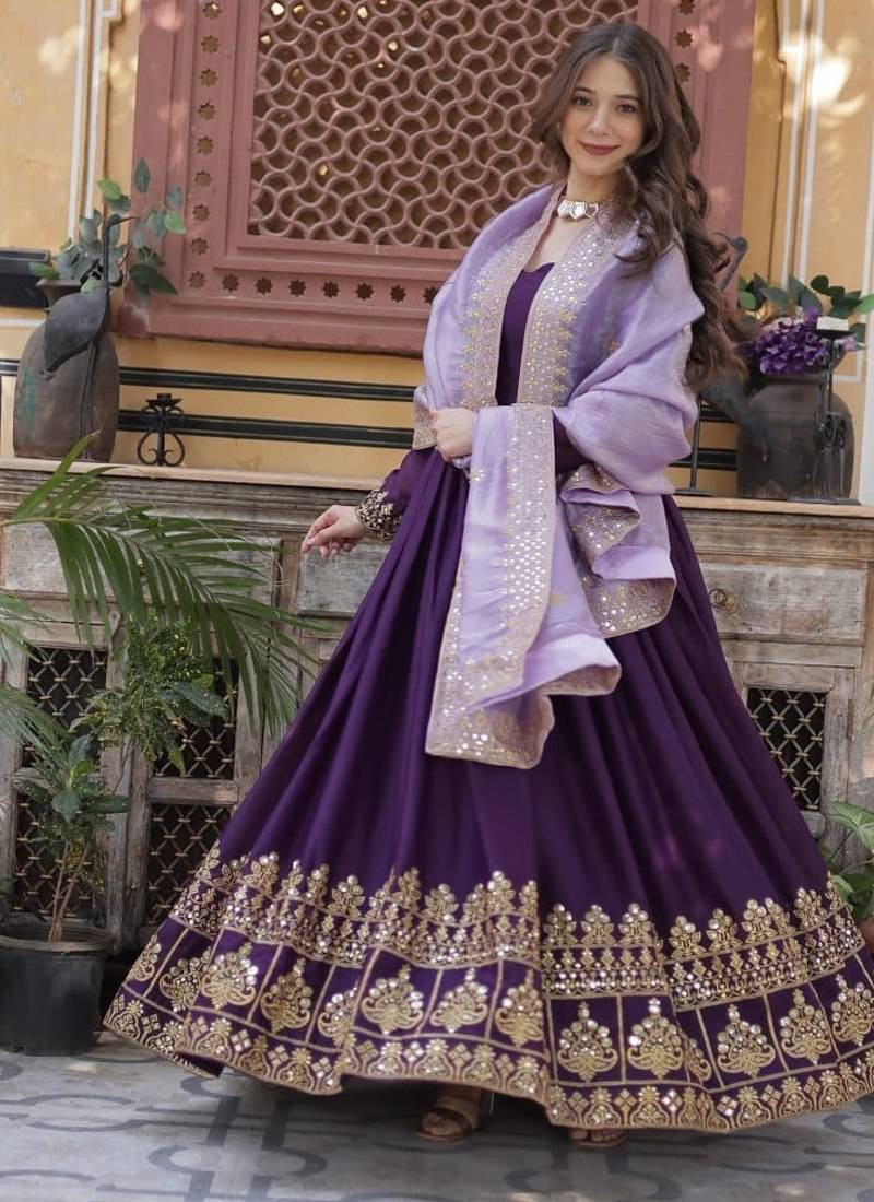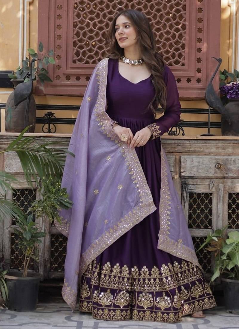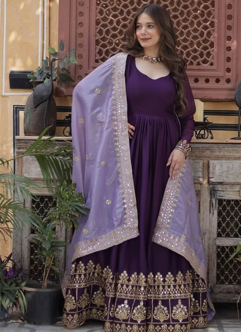 Purple star georgette with embroidery zari sequins-work suit set stitched