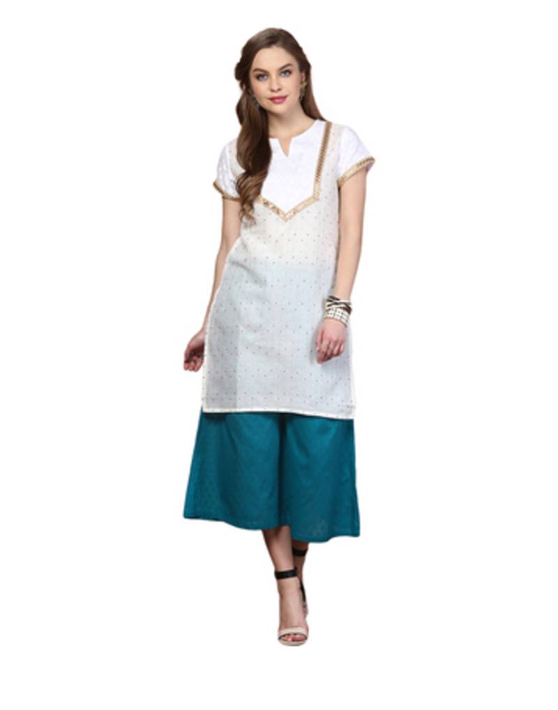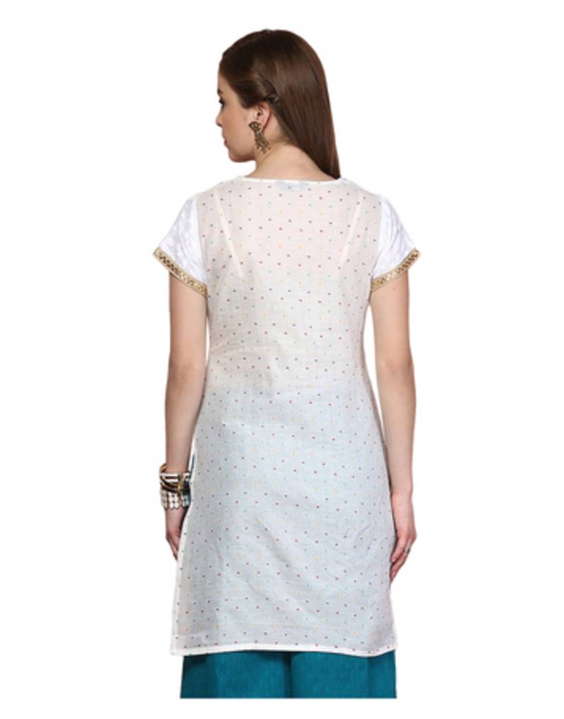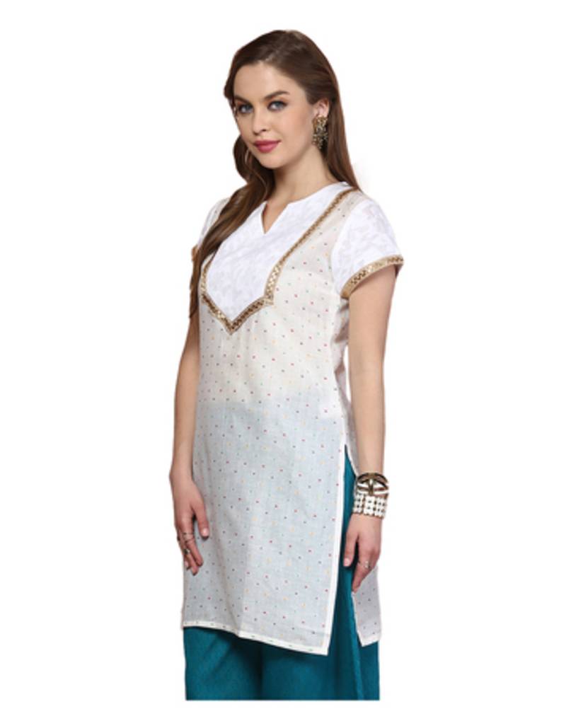 | Product Description | Product Type Women's Kurti Color White Pattern & Fit Regular Fit Kurti With Stylized Neck Having Slit, Contrast Yoke At Front Highlighted With Lace And Sleeves With Lace Hem. Neck & Sleeves Round Neck & Short Sleeves Fabric Cotton Blend Kurti Length 36 (Inches) Care Machine/Hand Wash. Style Tip Pair Up With Salwar And Ring Toed Flats! This Model Has Height 5'7", Bust 32" And Is Wearing Size Xs. |