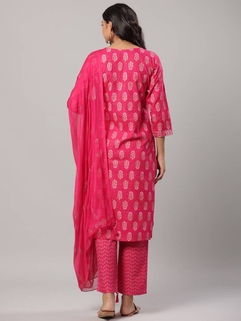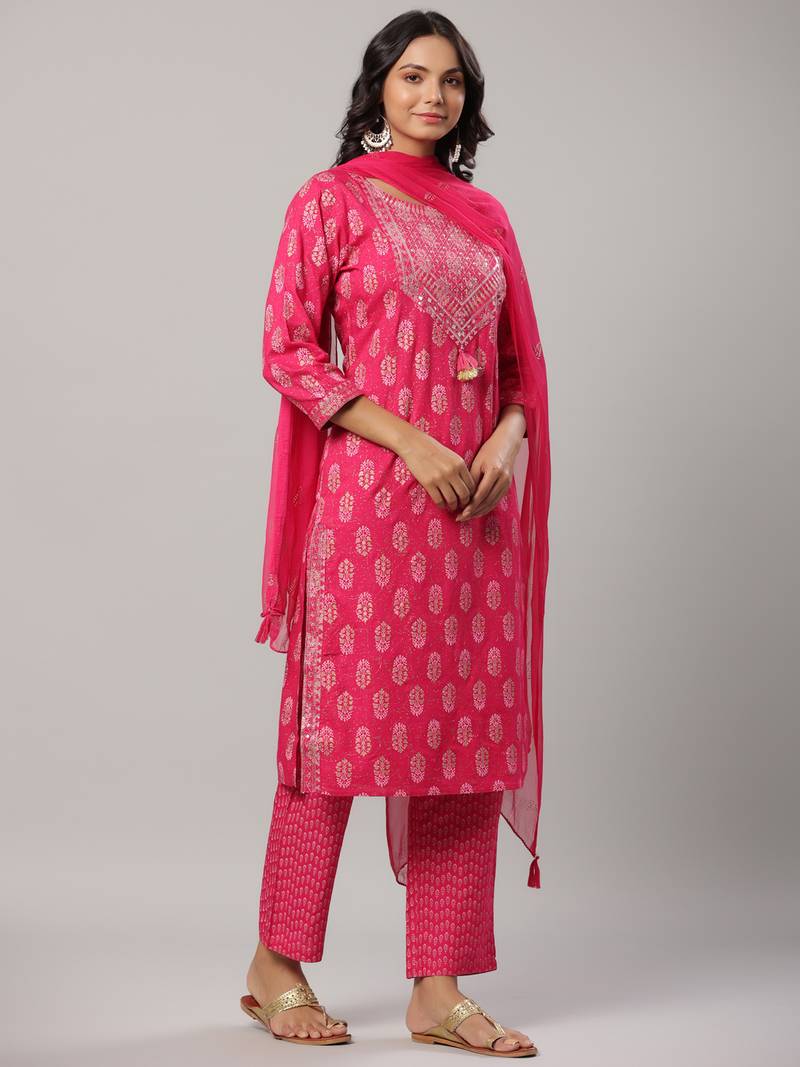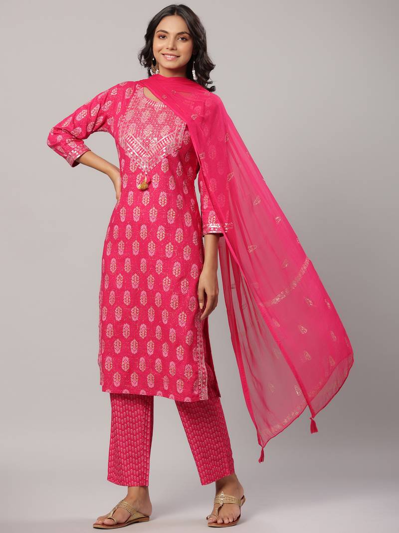 | Product Description | Fuchsia Embroidered Kurta With Trousers And Dupatta Kurta Design: Block Print Straight Shape Regular Style Round Neck, Three Quarter Regular Sleeves Button On Yuke Sequin Detail Calf Length With Straight Hem Rayon Machine Weave Fabric Trousers Design: Printed Trousers Elasticated Waistband Slip On Closure Material & Care 100% Rayon, Hand Wash |
