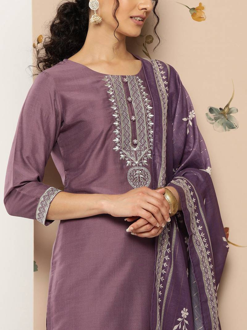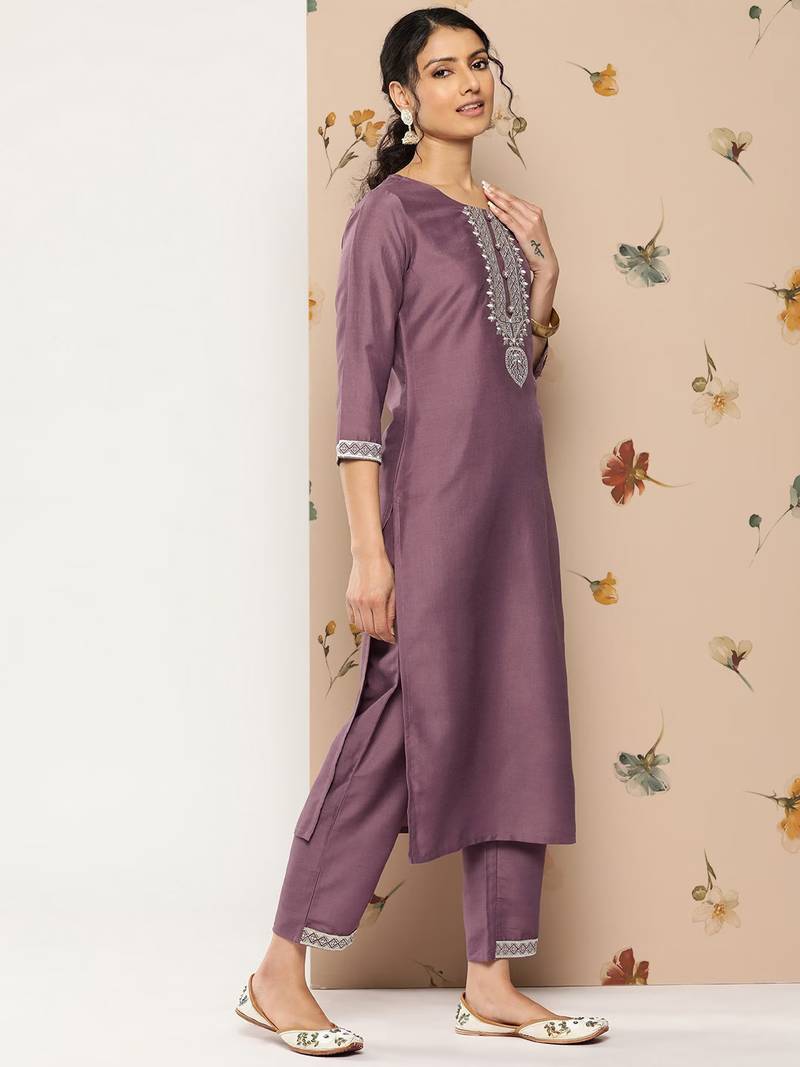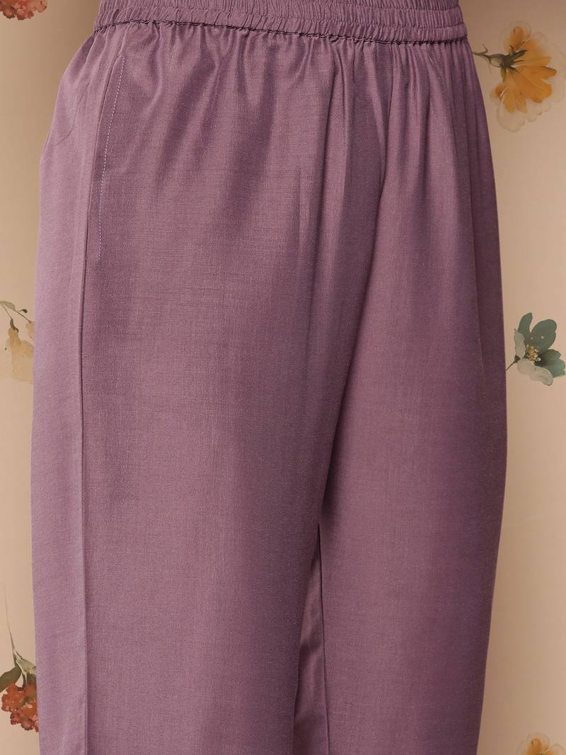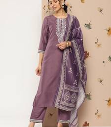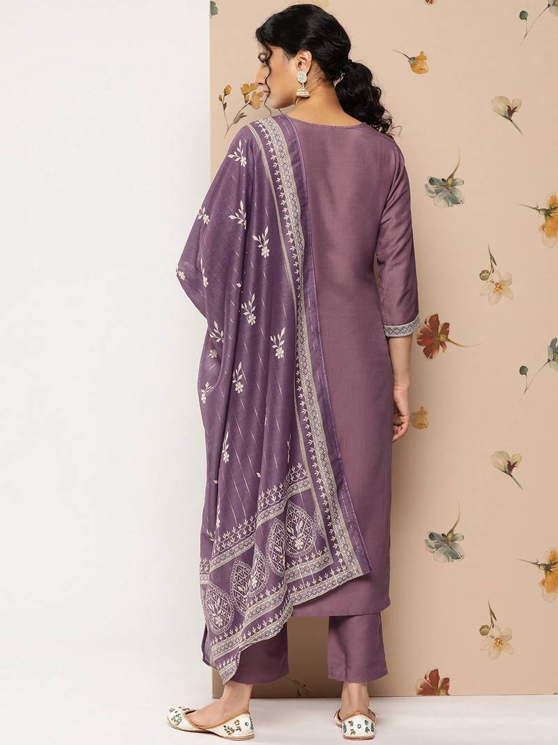 | Product Description | Purple Solid Kurta Trouser And Dupatta Set Kurta Design:Zari Work Straight Shape Regular Sleeve Three Quarter Sleeve Round Neck Calf Length Samaira Silk Kurta Pant & Dupatta With Straight Hem Silk Blend Machine Weave Fabric Trouser Design: Solid Trouser Slip On Waistband Size & Fit Material & Care Silk Blend Dry Clean |