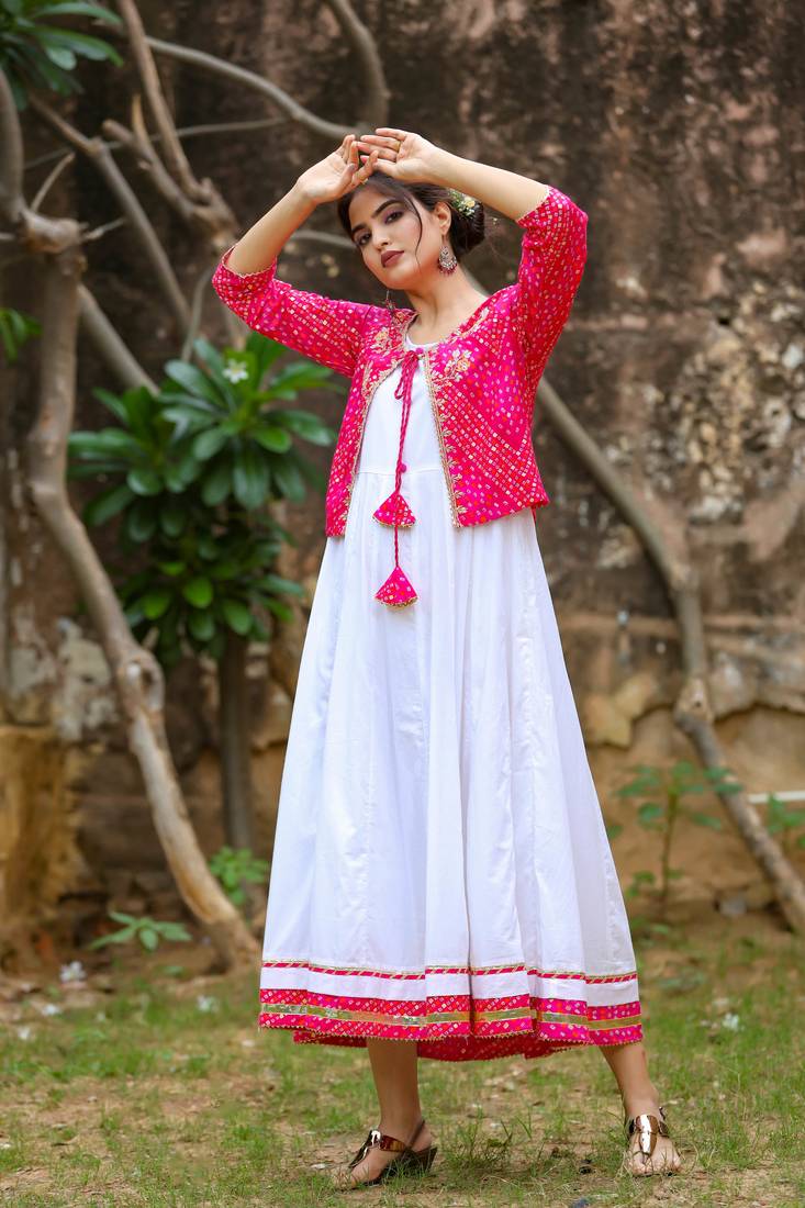 | Product Description | Yufta Women's White & Pink Bhandhej Printed Flared Dress With Jacket |