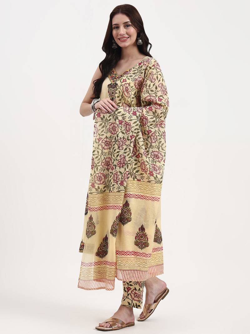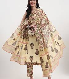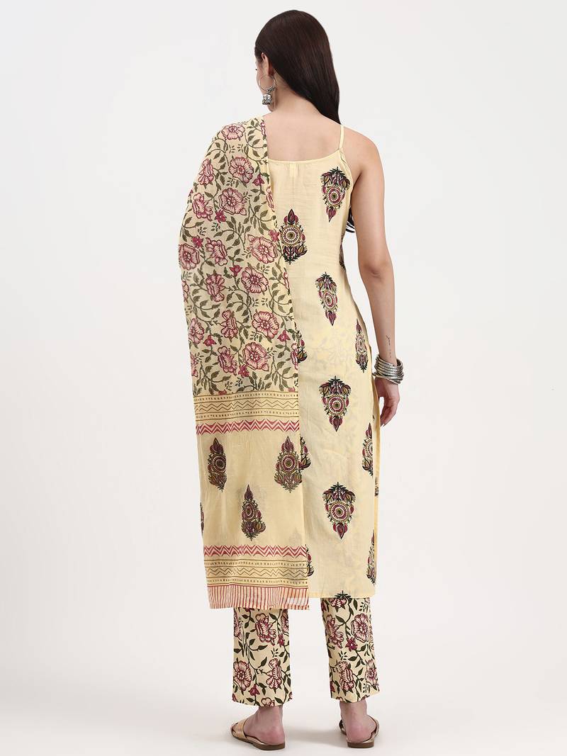 Yufta beige pure cotton sequins work straight kurta trouser dupatta set